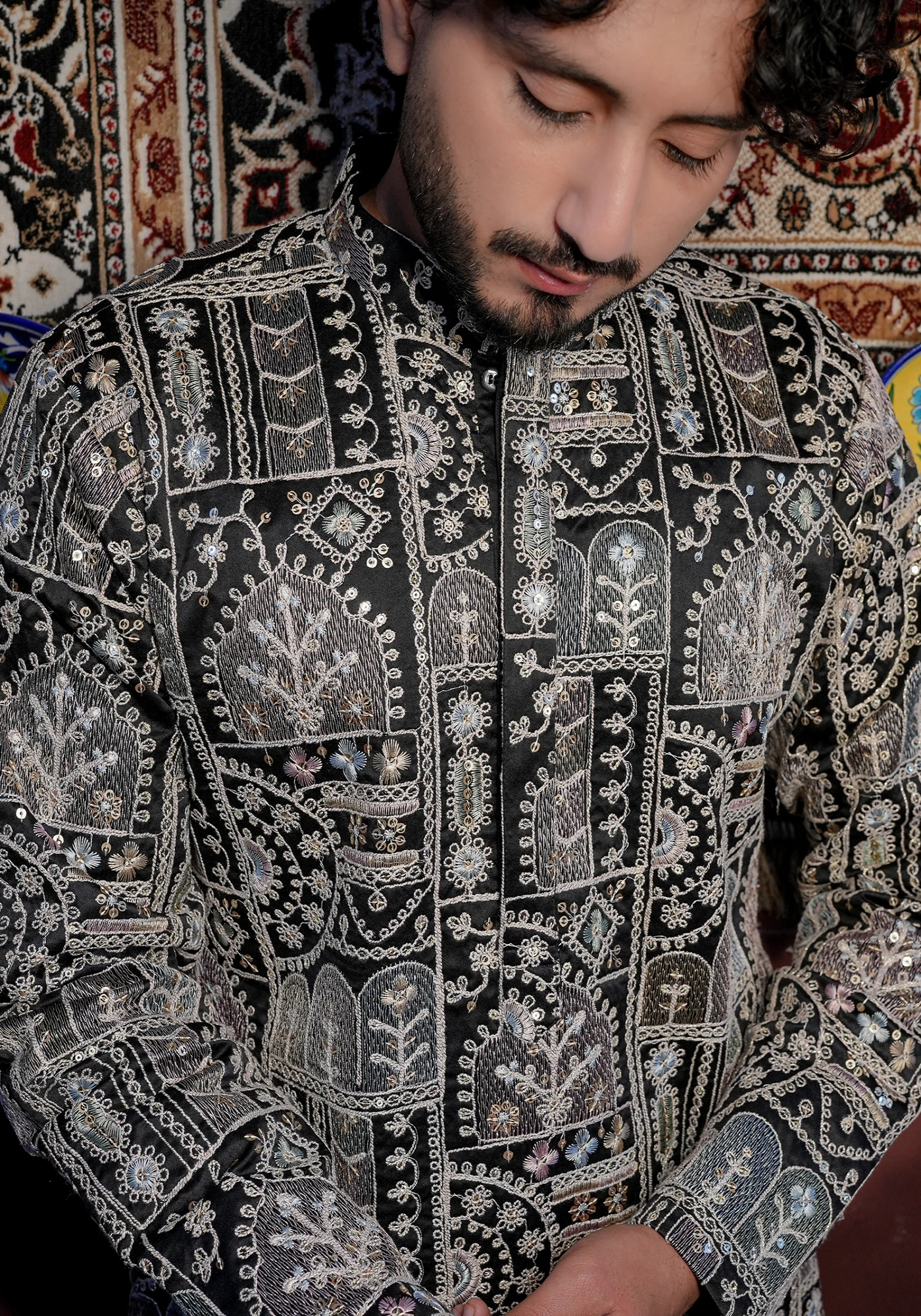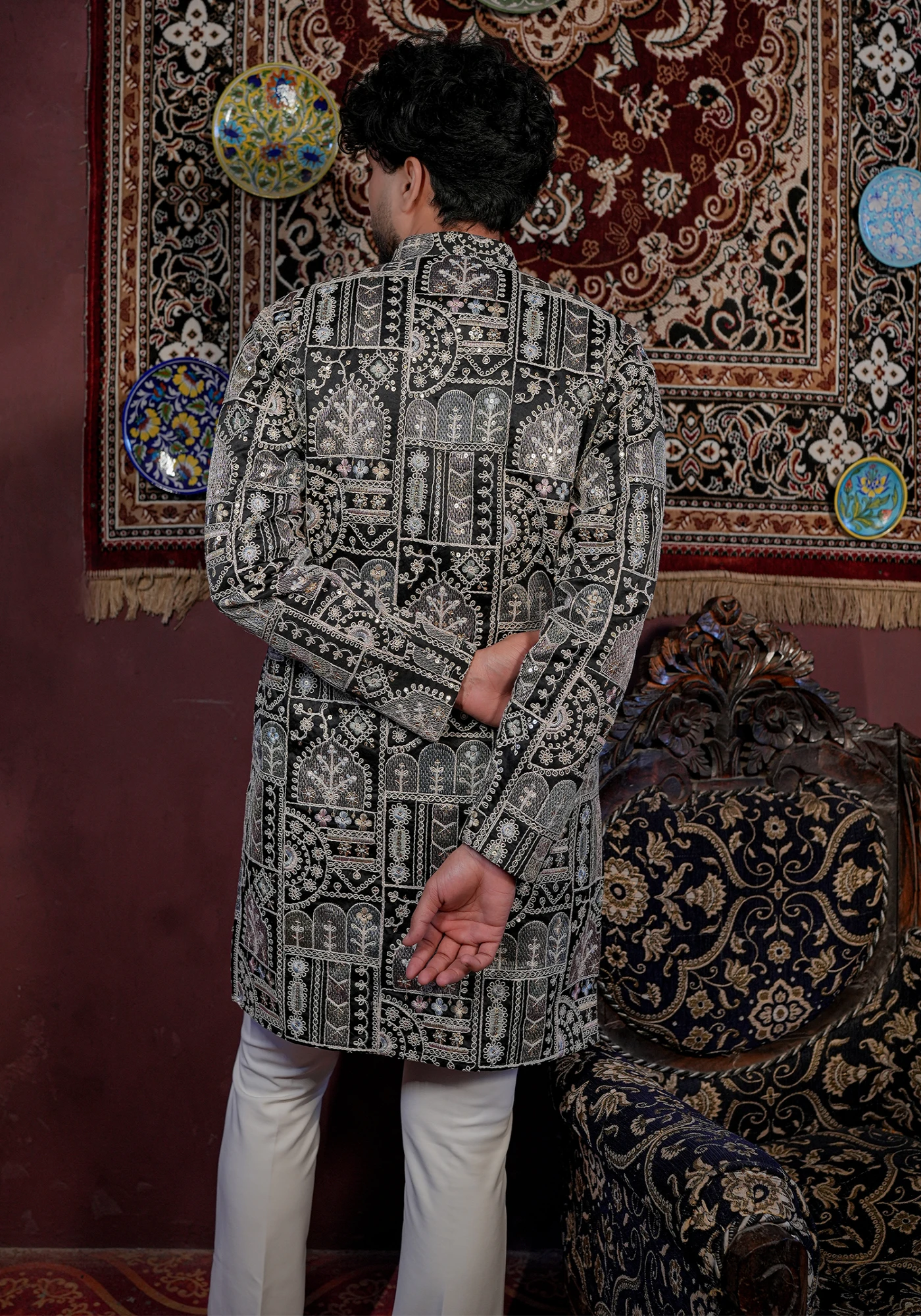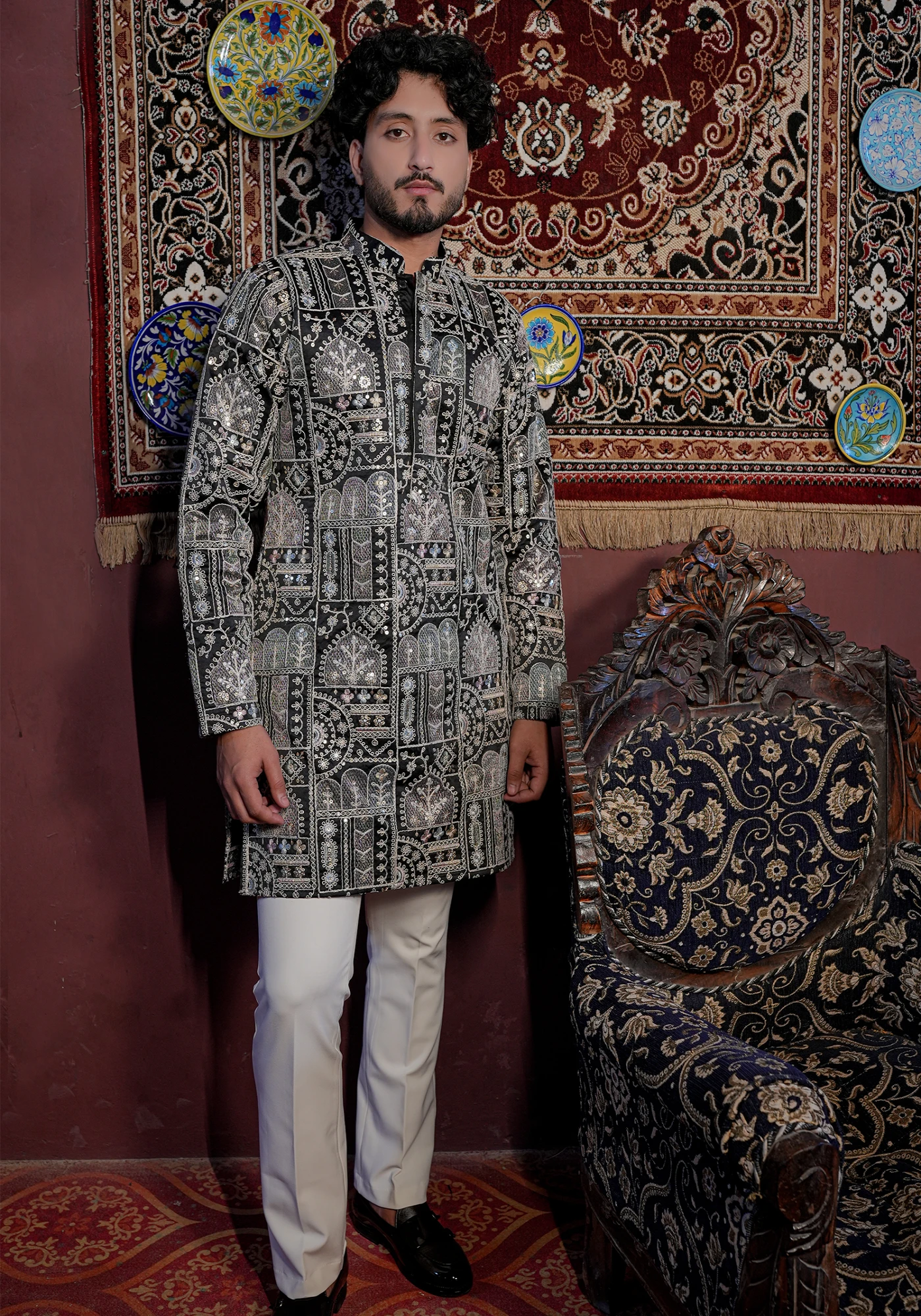 Pair this kurta with ivory or off-white trousers and classic mojris for a royal festive look, or style with black pants for a bold evening ensemble.