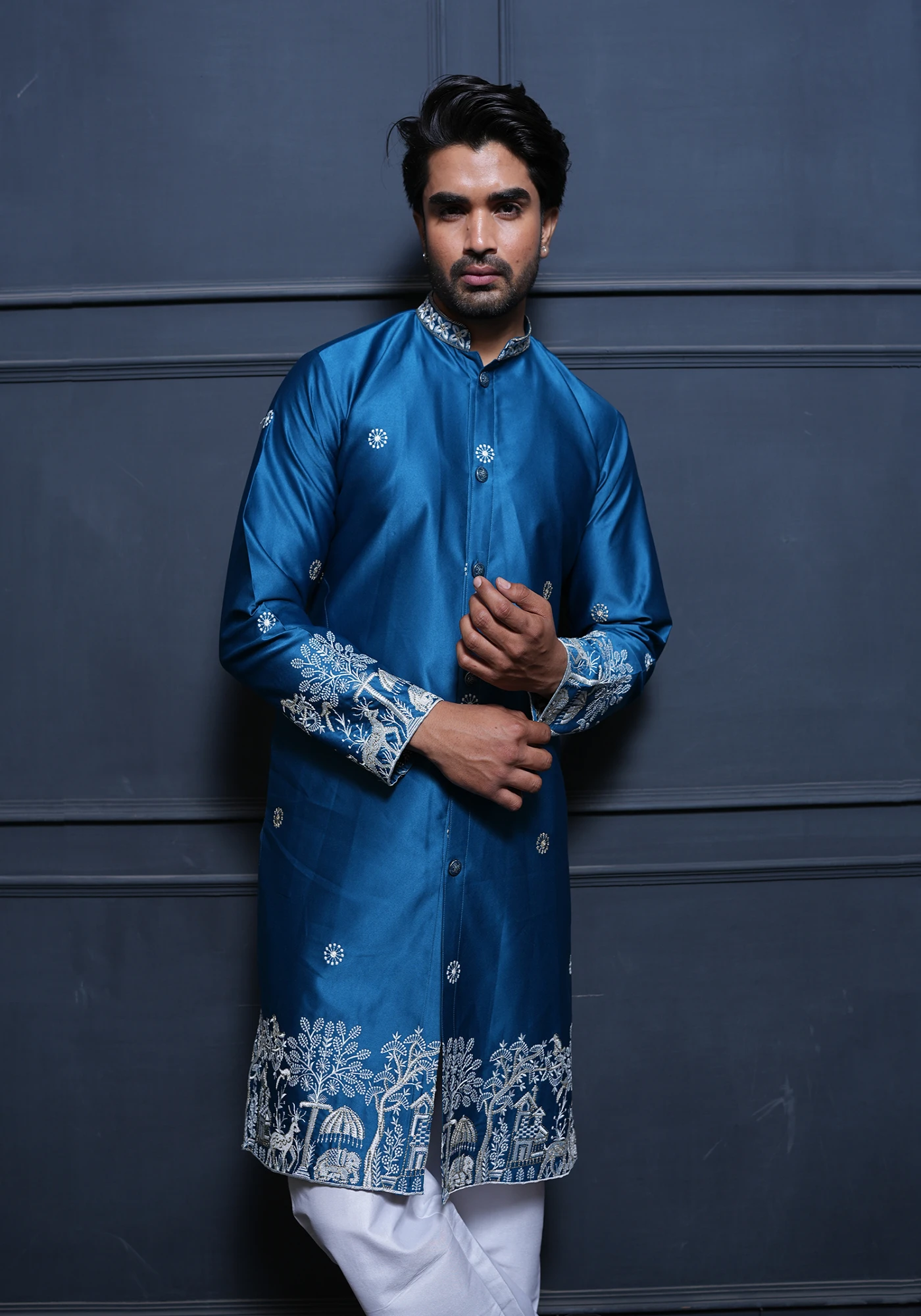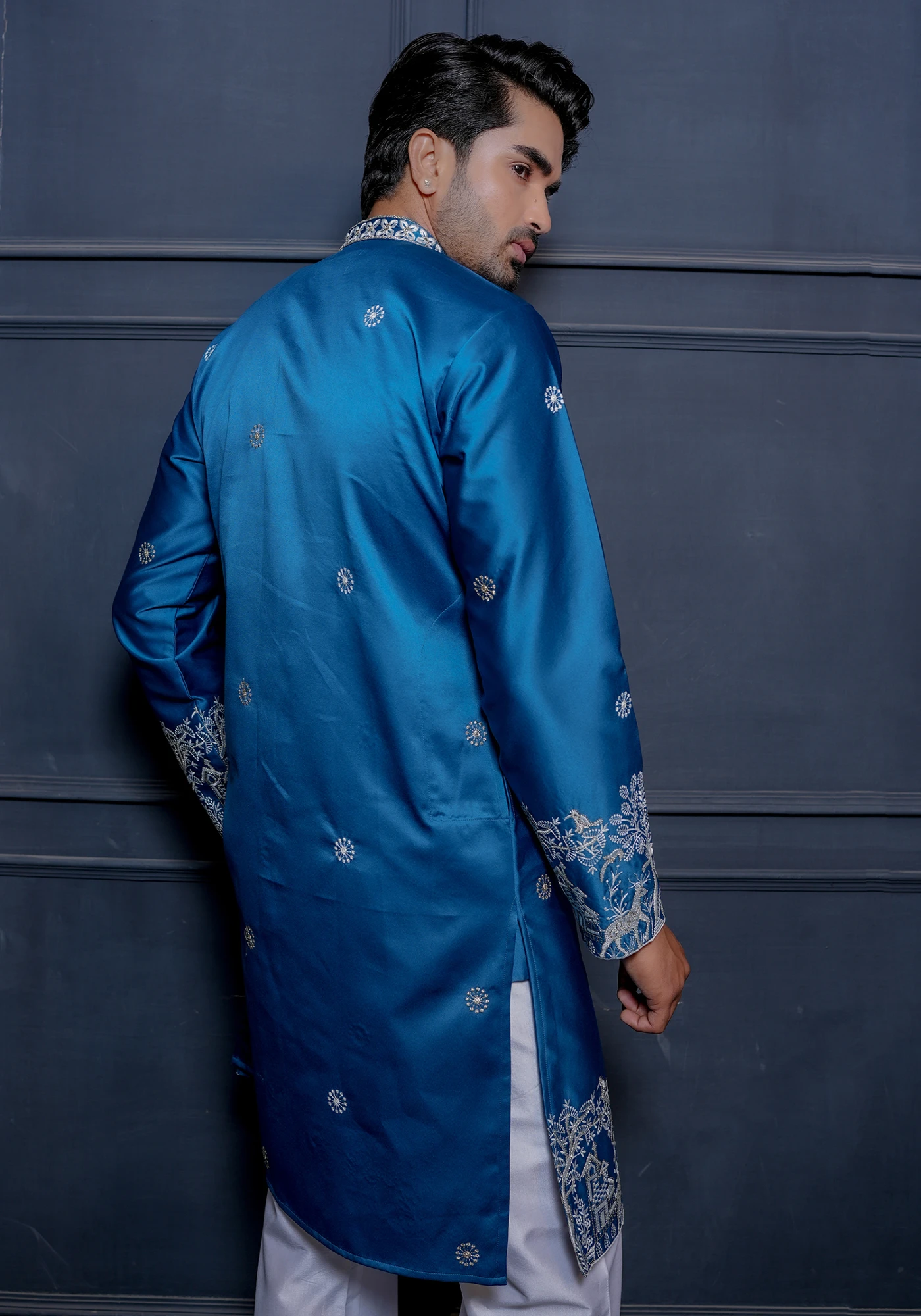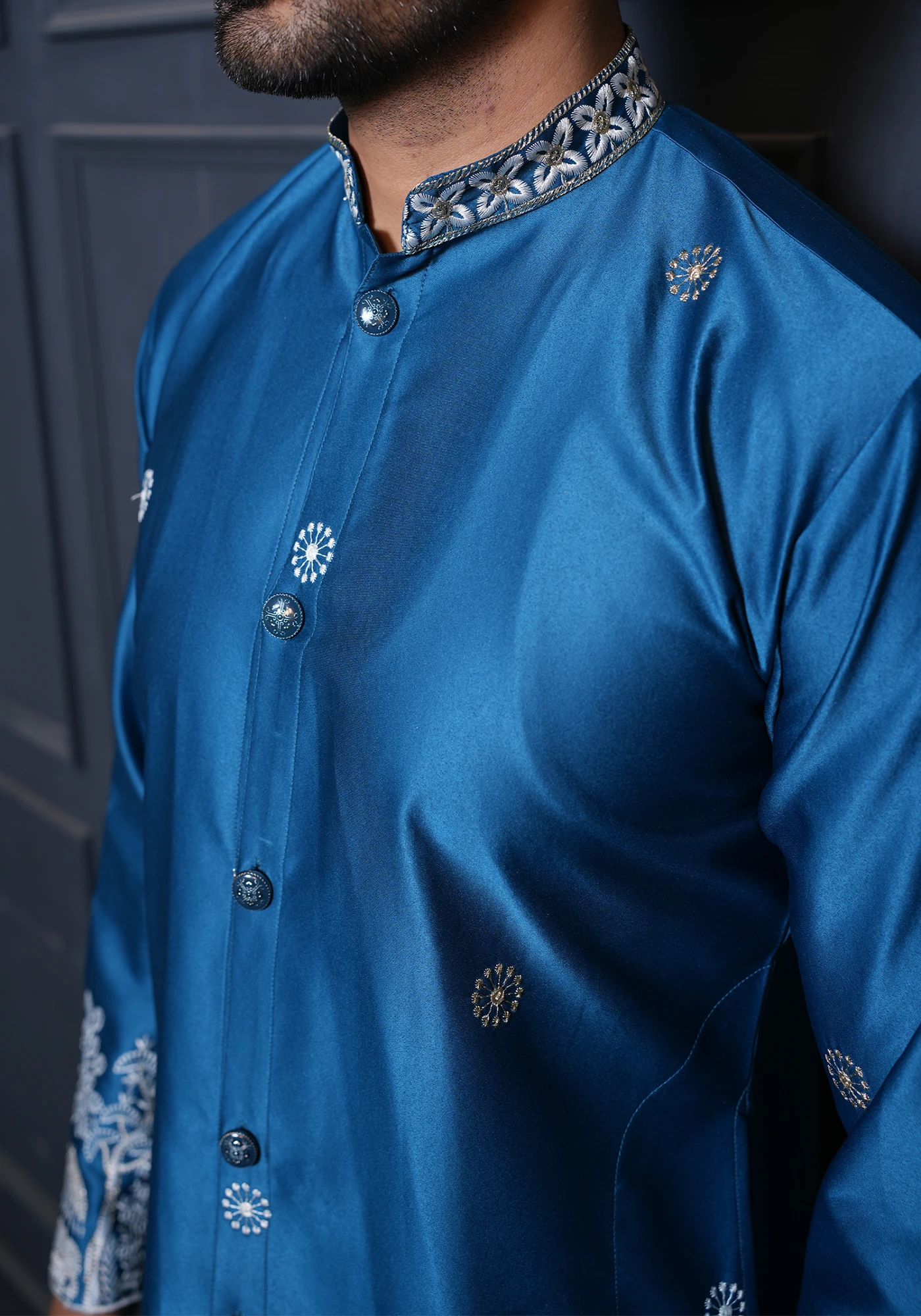 Bold yet refined, this Teal Blue Embroidered Designer Kurta is crafted for men who appreciate statement elegance. The rich teal base is enhanced with intricate ivory-toned embroidery along the cuffs and hem, creating a striking contrast that exudes royal charm. Designed in a structured, modern silhouette with a front buttoned placket, it blends traditional artistry with contemporary sophistication. Perfect for weddings, receptions, and grand festive occasions, this kurta ensures a polished and commanding presence.