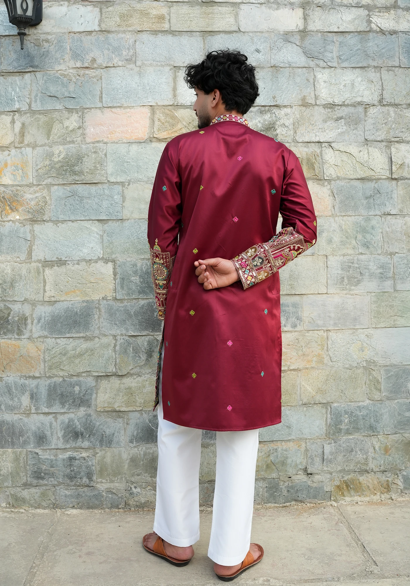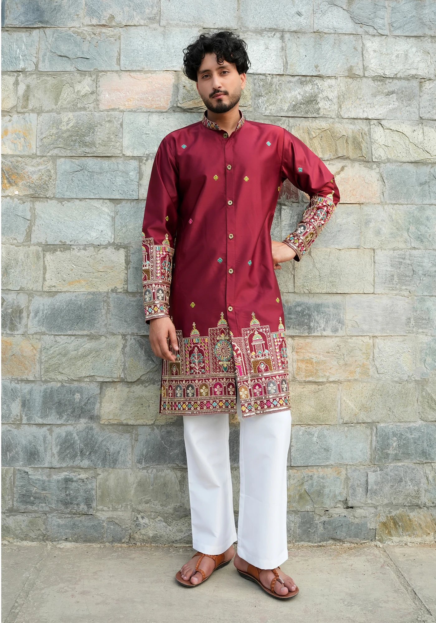 Make a bold style statement with this Maroon Front Open Indo-Western Kurta, designed for modern festive elegance. Featuring a structured front-open silhouette, this design blends traditional ethnic charm with contemporary jacket-style tailoring. The rich black base is enhanced with intricate multicolor embroidery along the sleeves and hem, creating a striking visual appeal. Crafted for both comfort and sophistication, it offers a sharp tailored fit ideal for weddings, receptions, and festive celebrations. Perfect for men who prefer standout ethnic fashion with a modern edge.