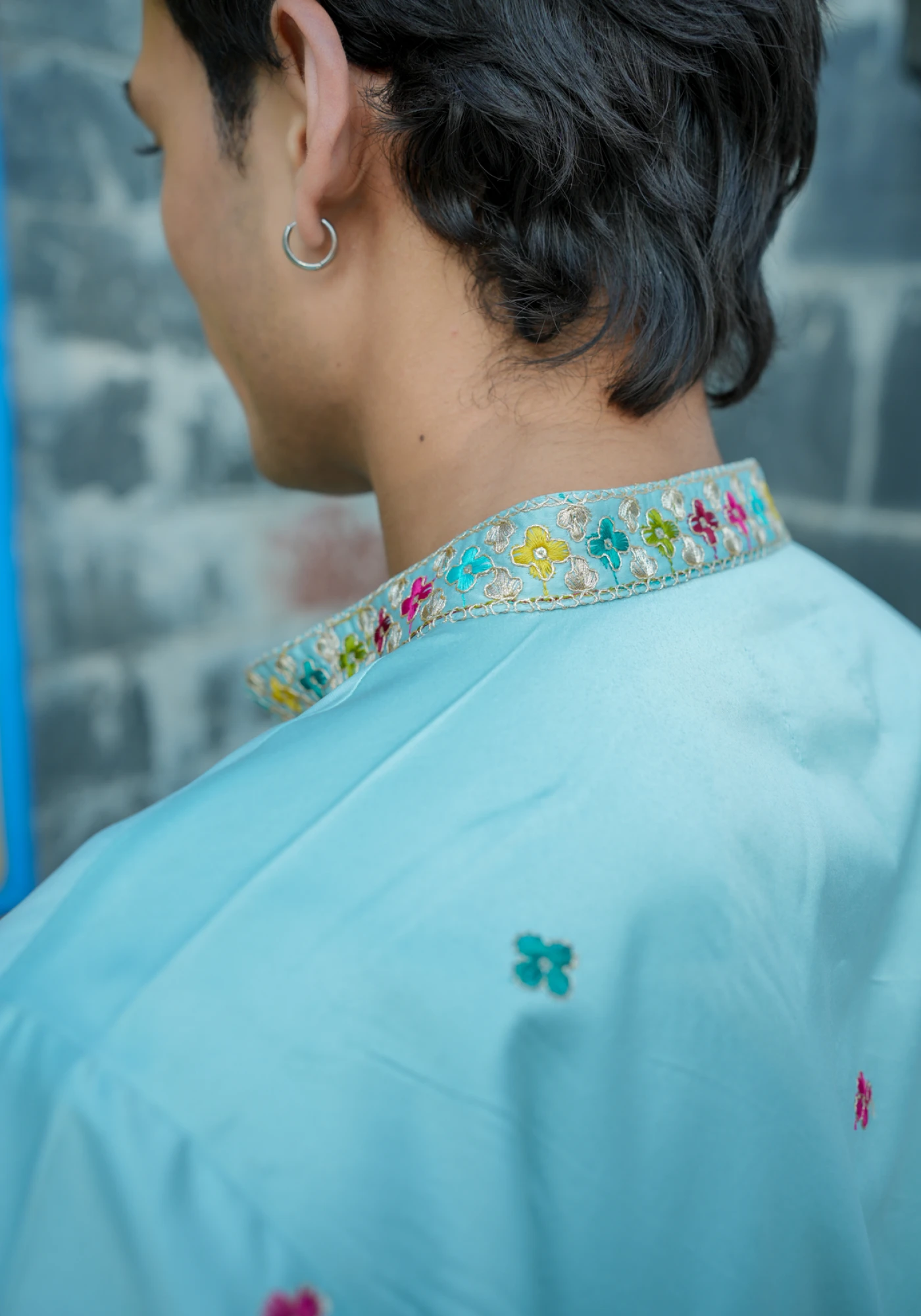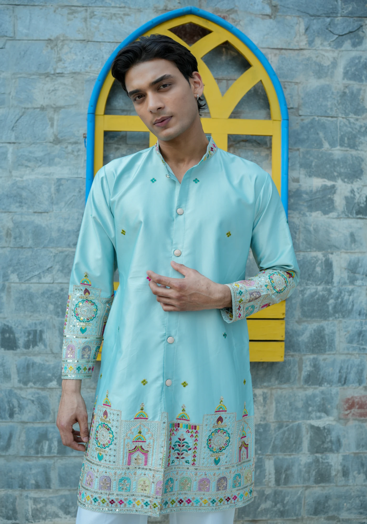 Make a bold style statement with this Skyblue Front Open Indo-Western Kurta, designed for modern festive elegance. Featuring a structured front-open silhouette, this design blends traditional ethnic charm with contemporary jacket-style tailoring. The rich black base is enhanced with intricate multicolor embroidery along the sleeves and hem, creating a striking visual appeal. Crafted for both comfort and sophistication, it offers a sharp tailored fit ideal for weddings, receptions, and festive celebrations. Perfect for men who prefer standout ethnic fashion with a modern edge.