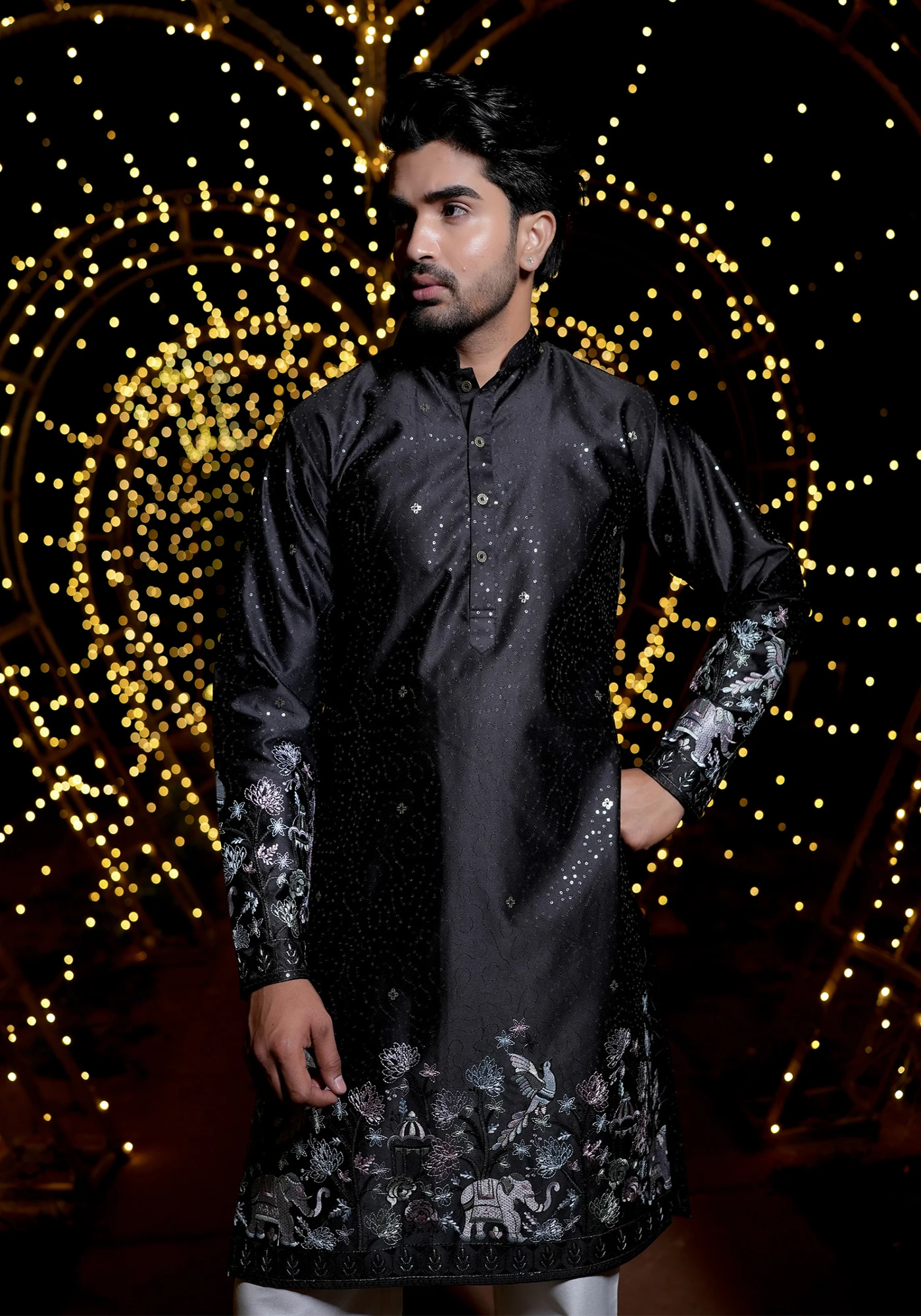 A refined expression of modern elegance, this black designer kurta showcases intricate embroidery on a rich textured base. Crafted for sophisticated celebrations, it blends timeless craftsmanship with contemporary festive luxury.