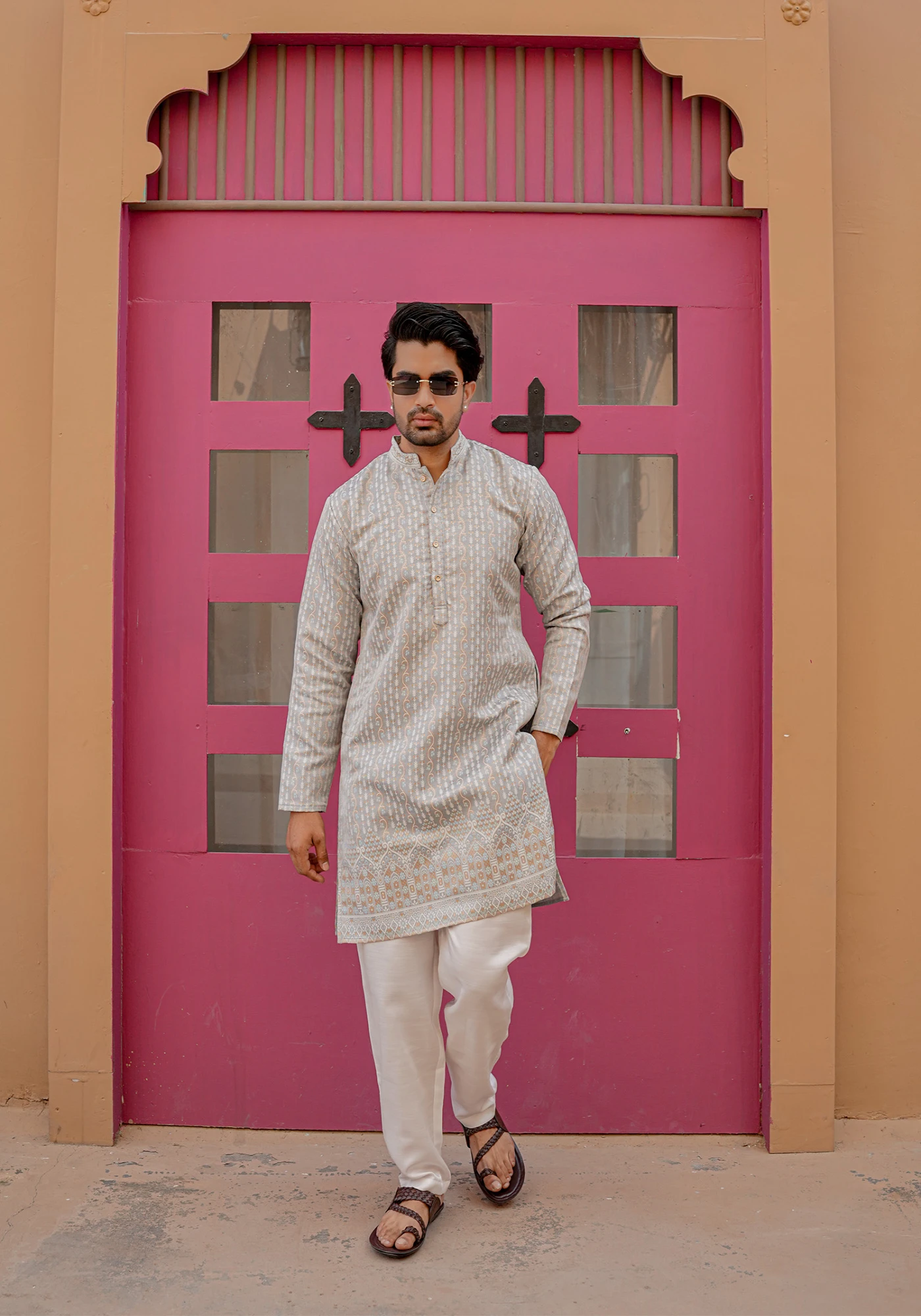 Pair with ivory or off-white trousers and tan mojris for a fresh daytime festive look with understated elegance.