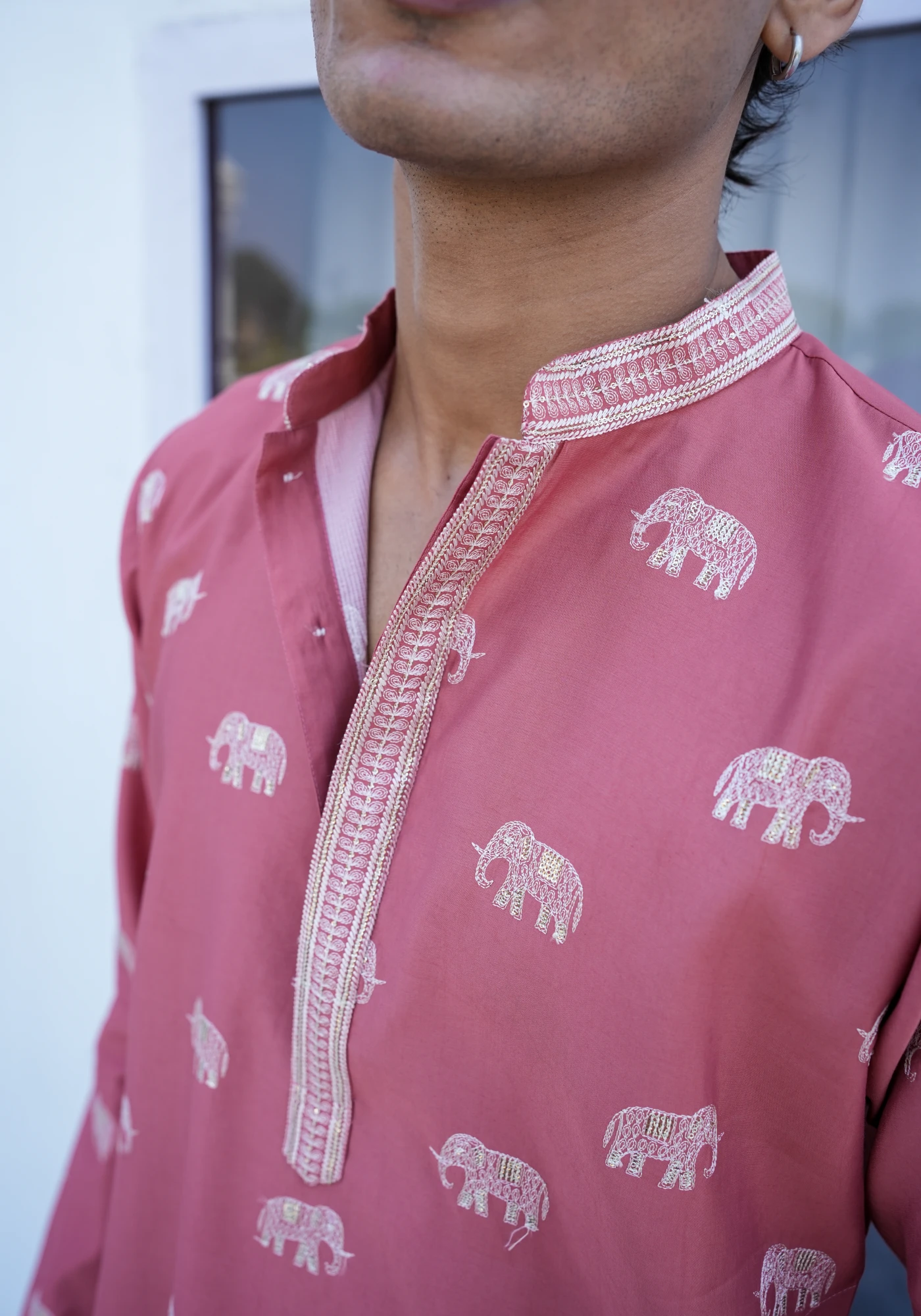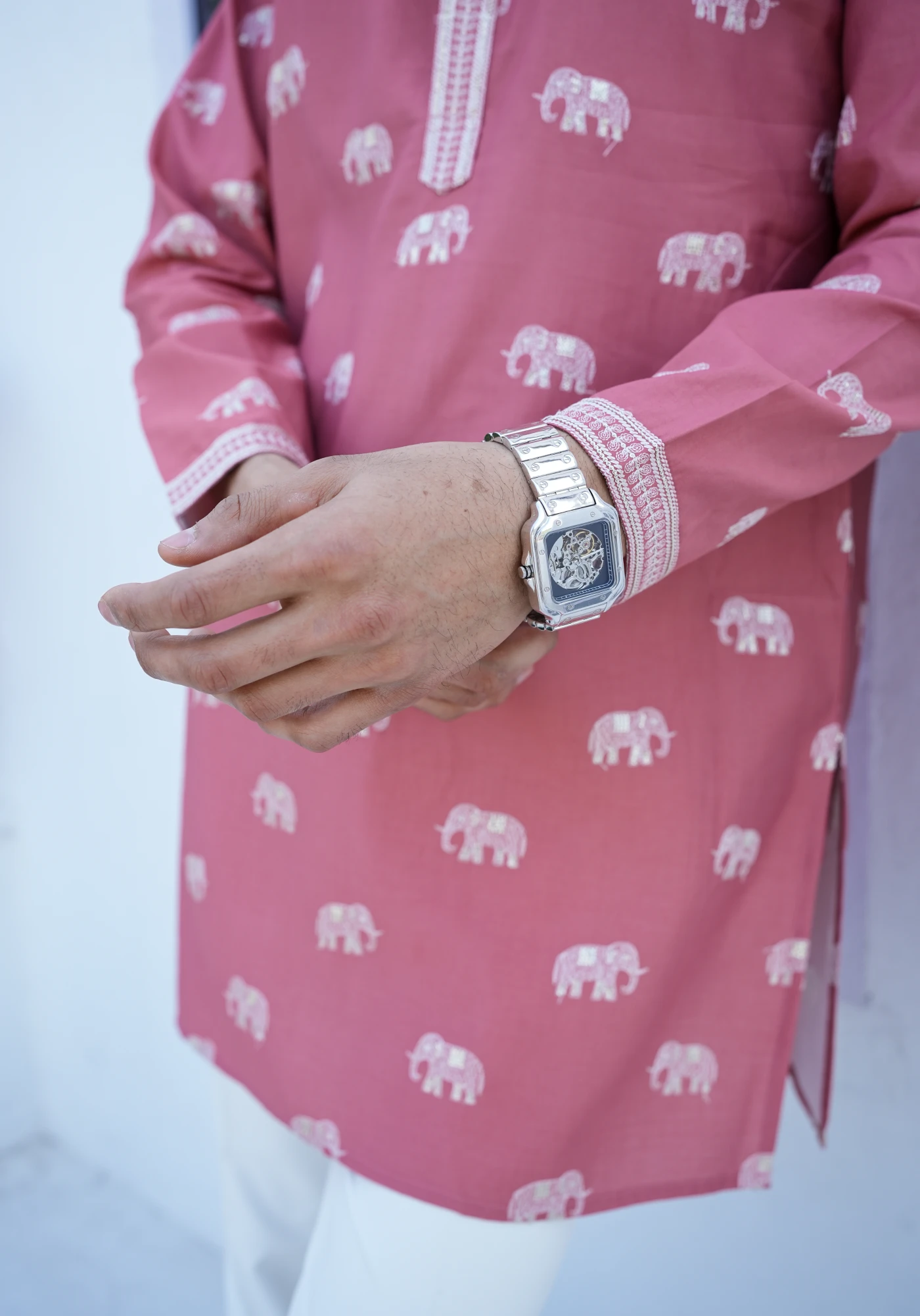 Playful yet refined, this Rose Pink Elephant Print Kurta brings a fresh twist to traditional menswear. Crafted in a soft, breathable fabric, it features charming elephant motifs across the body, complemented by subtle contrast detailing along the neckline and cuffs. The relaxed yet tailored silhouette makes it perfect for daytime festivities, cultural celebrations, and pre-wedding functions. Designed for comfort and effortless style, this kurta adds personality while maintaining a polished festive appeal.