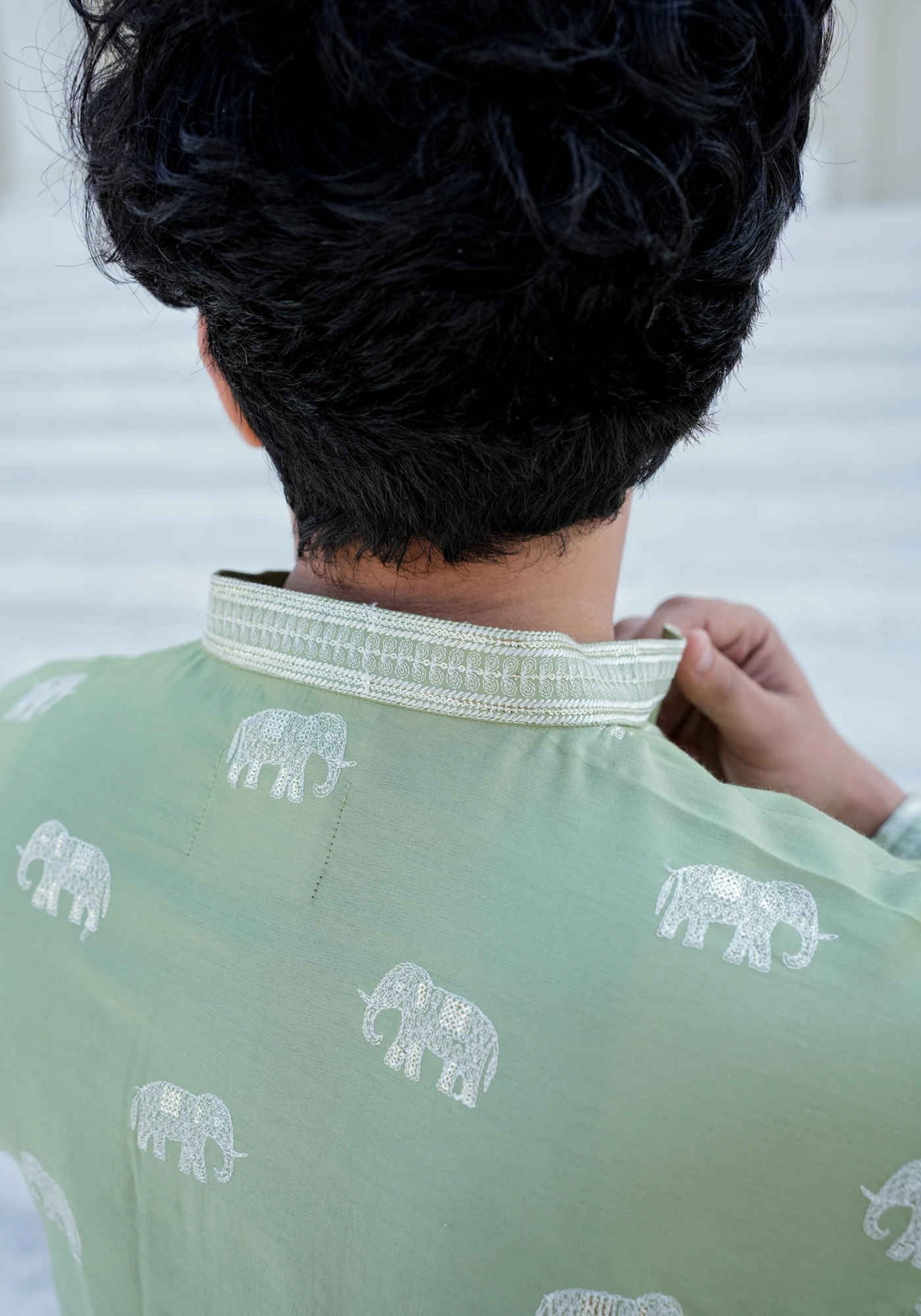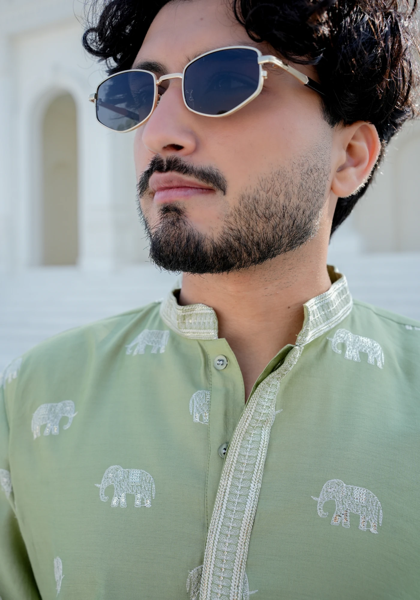 Subtle, fresh, and effortlessly stylish β this Sage Green Elephant Print Kurta blends traditional charm with contemporary ease. Crafted in a lightweight, breathable fabric, it features delicate elephant motifs throughout, complemented by contrast detailing along the neckline and cuffs. The soothing green tone makes it ideal for daytime celebrations, festive gatherings, and cultural occasions. Designed in a modern tailored silhouette, it offers comfort while maintaining a sharp, polished appearance.