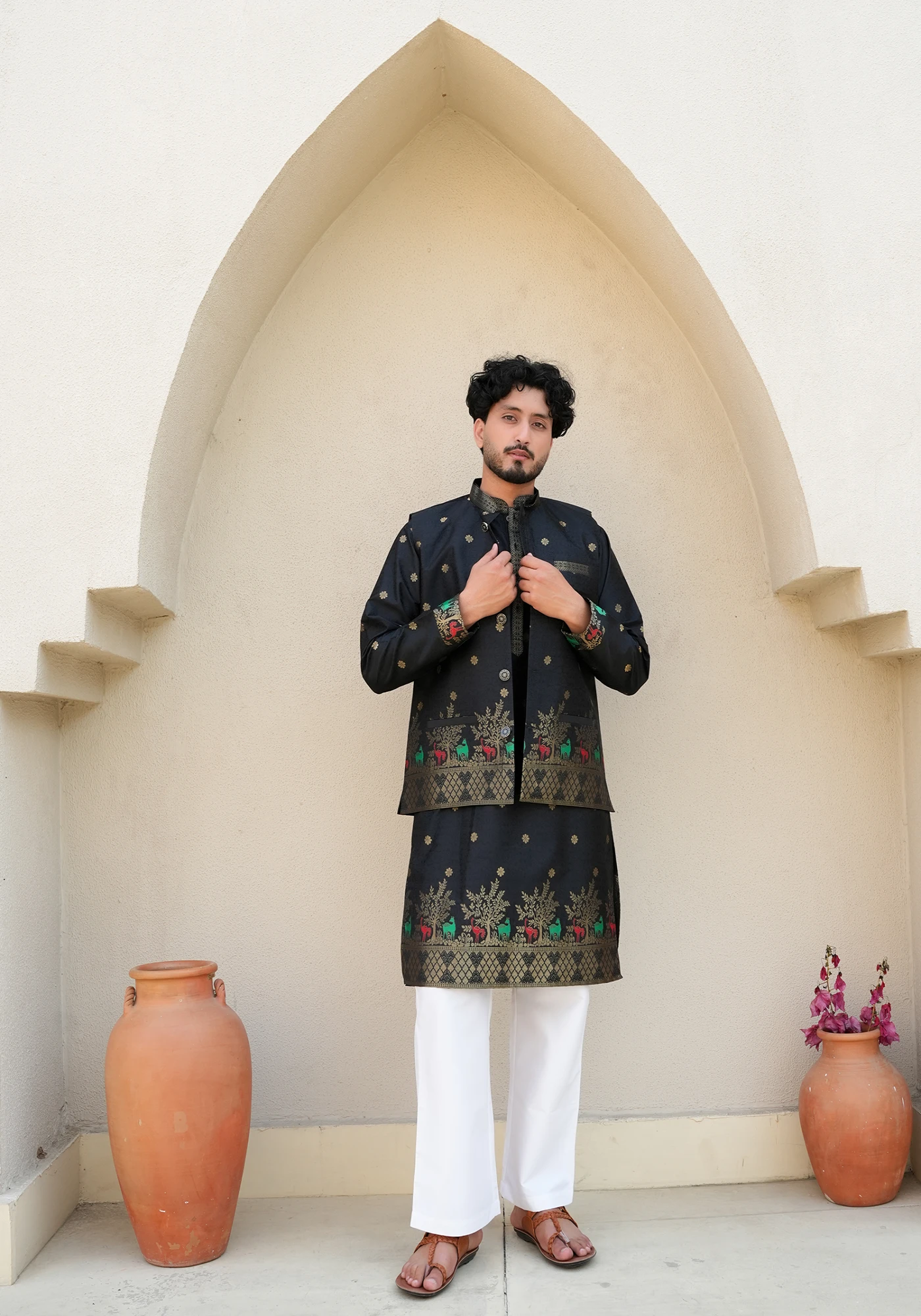 Pair with ivory or off-white trousers and brown sandals or mojris for a balanced festive look that highlights the rich jacquard detailing.