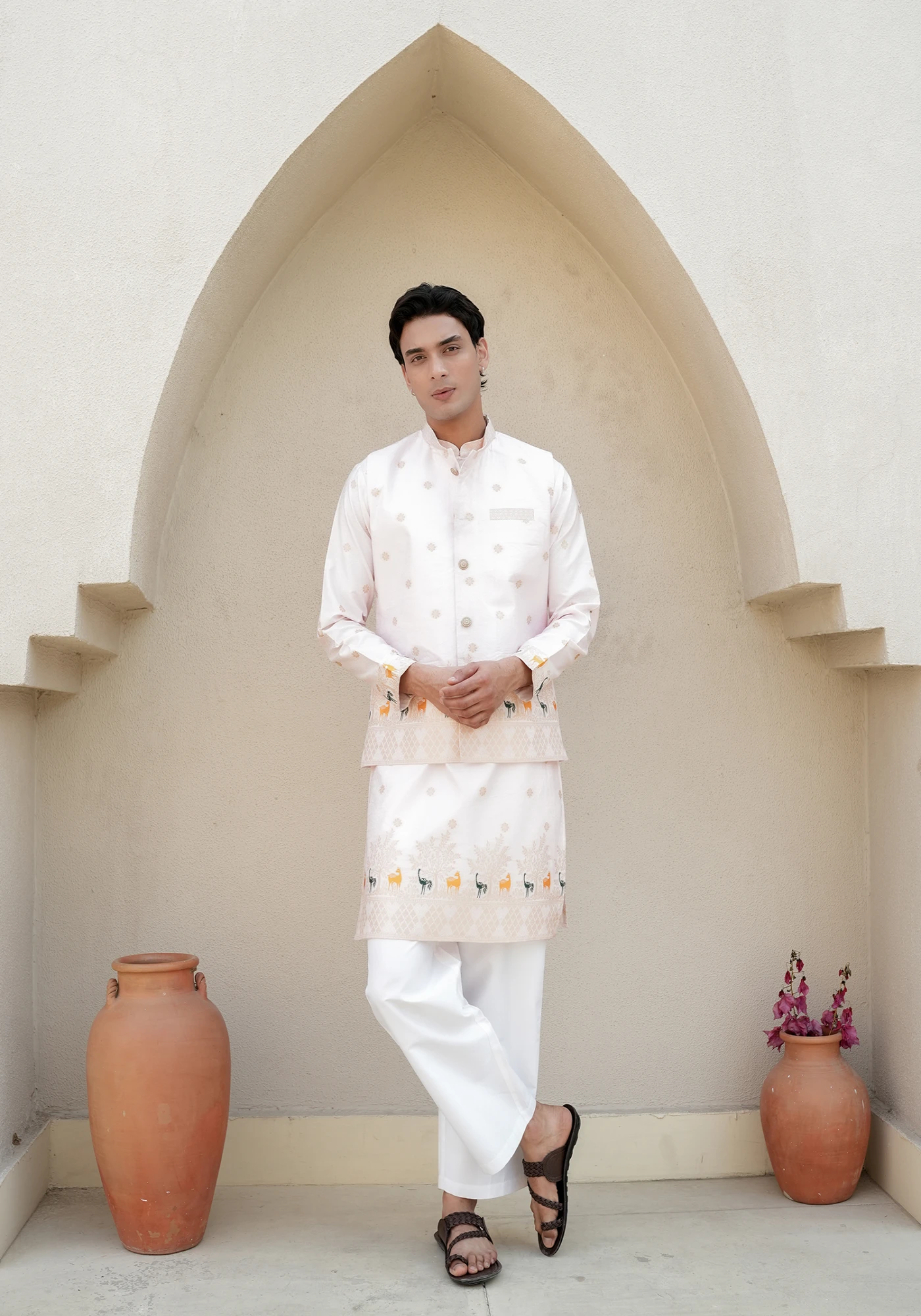 Pair with ivory or off-white trousers and brown sandals or mojris for a balanced festive look that highlights the rich jacquard detailing.