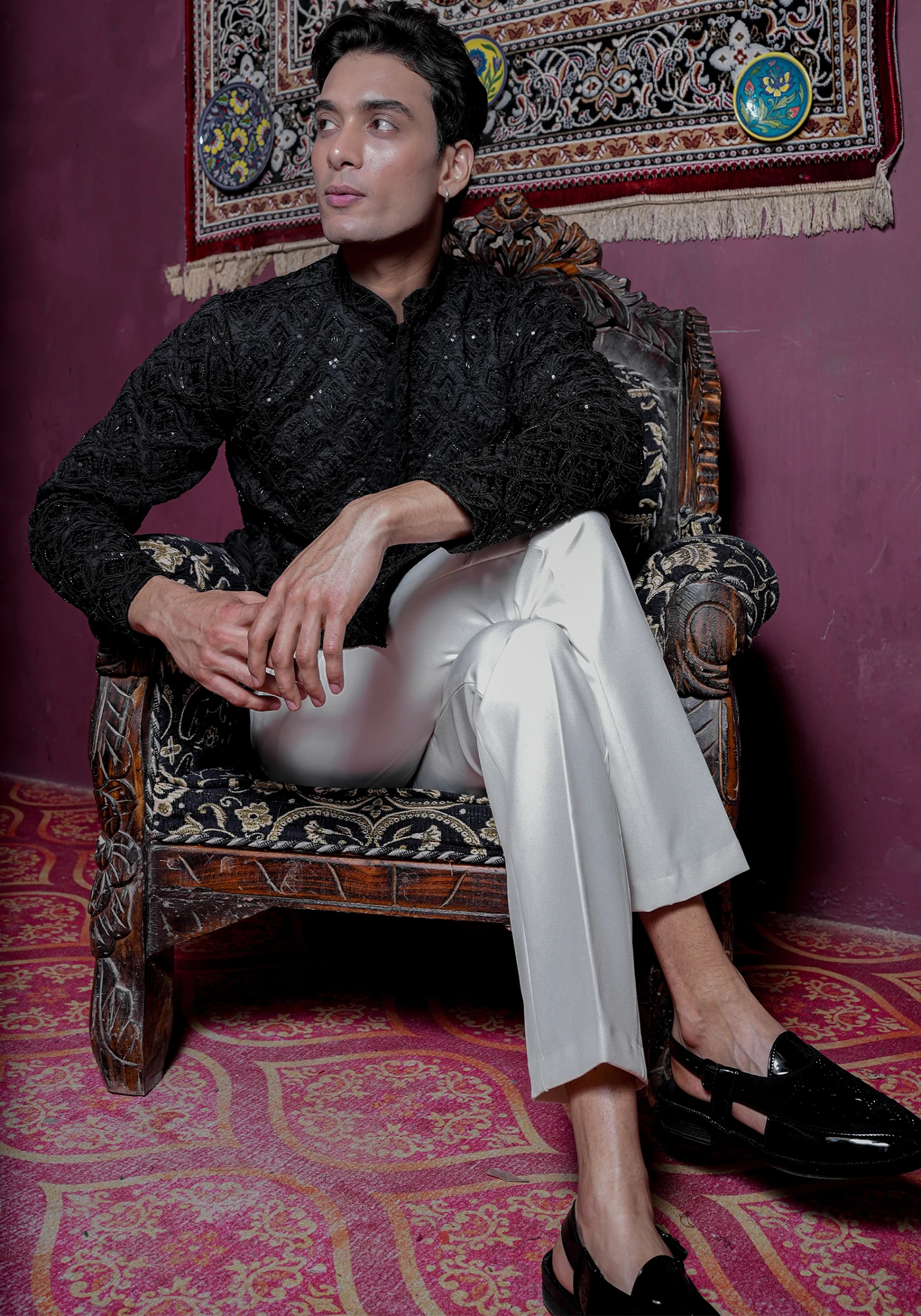 The deep black base enhances the detailed craftsmanship, giving it a powerful festive and reception-ready appeal. Tailored in a contemporary silhouette with full sleeves and a structured fit, it offers both comfort and elevated style for long wedding functions, cocktail nights, and festive gatherings.