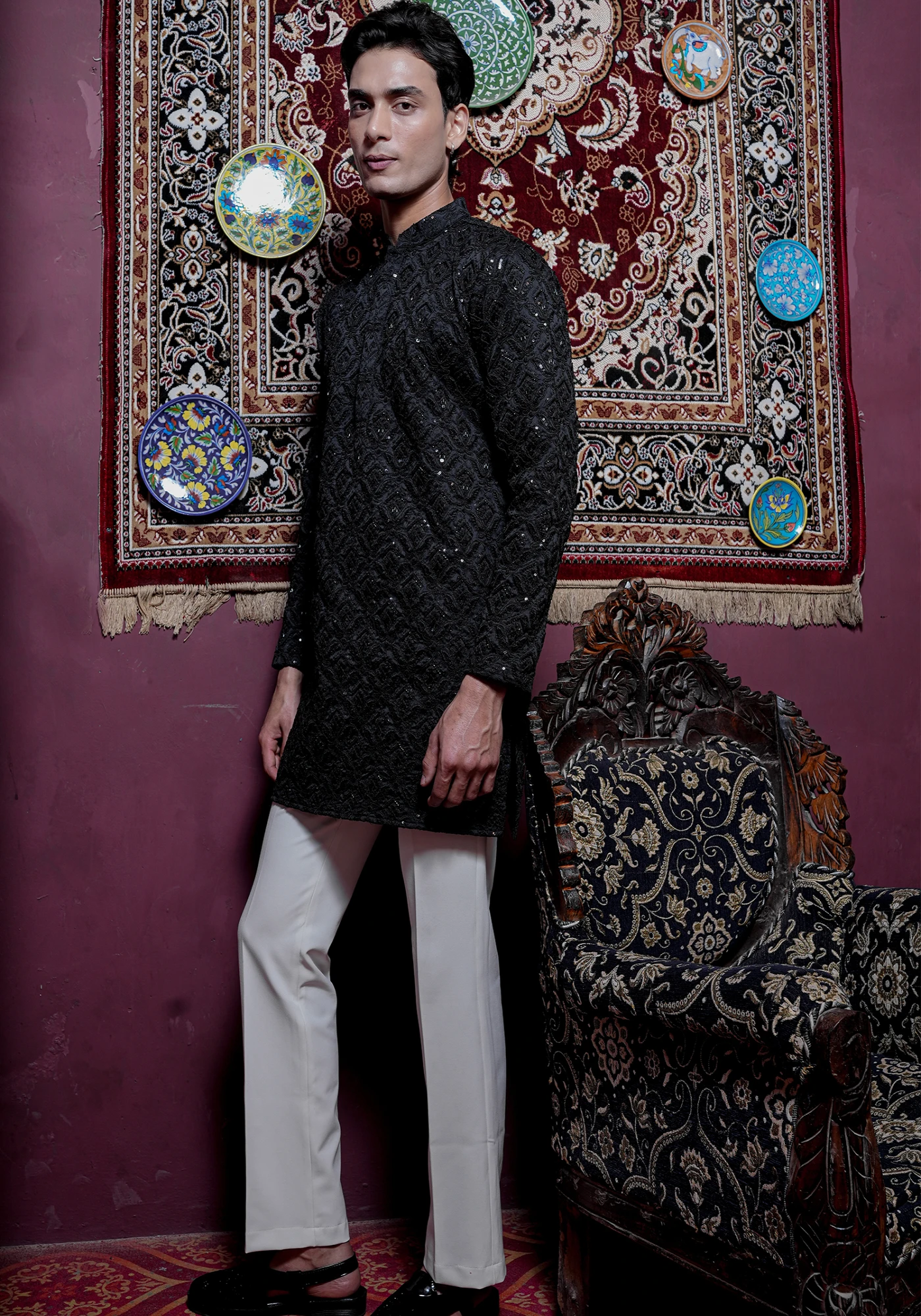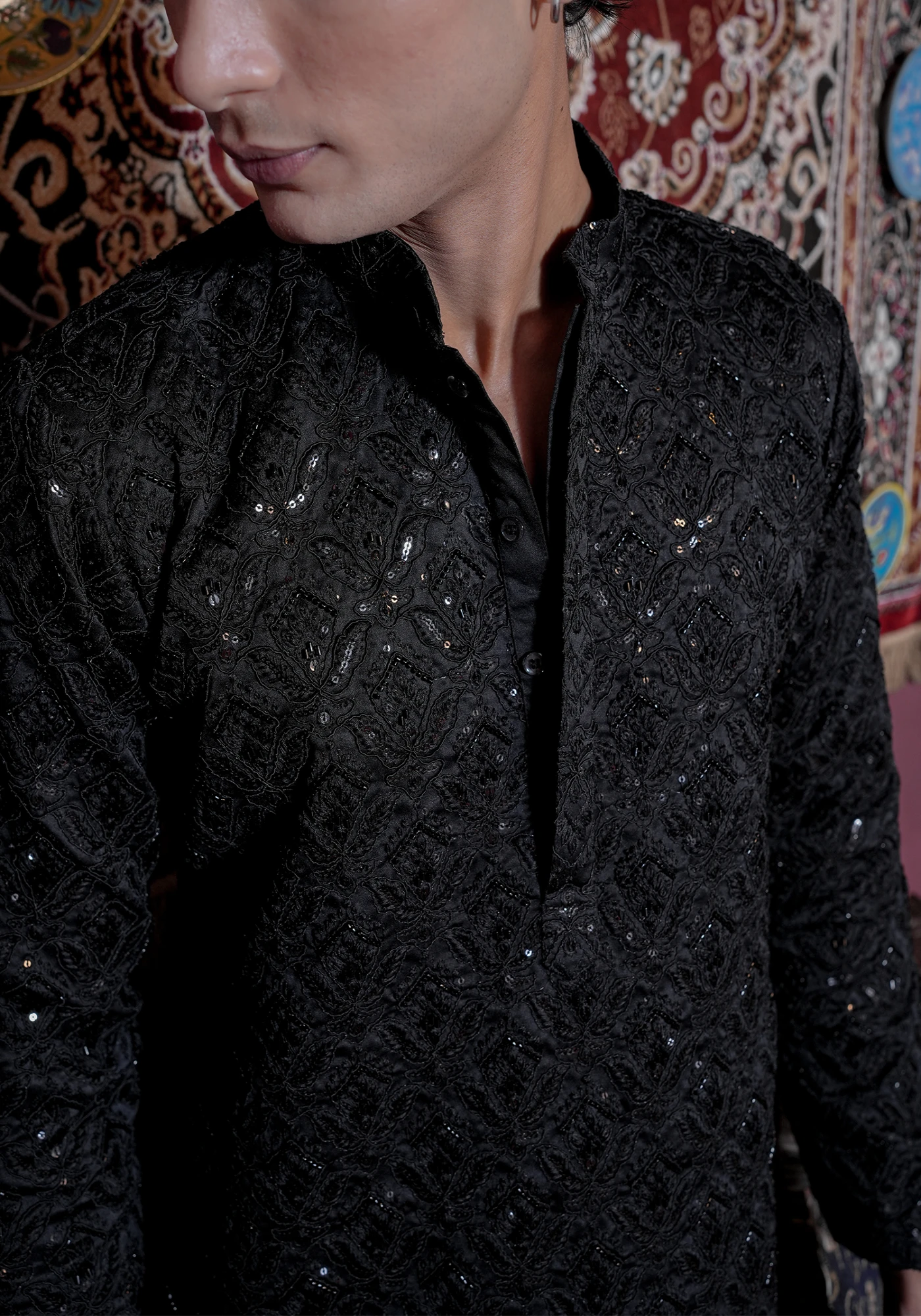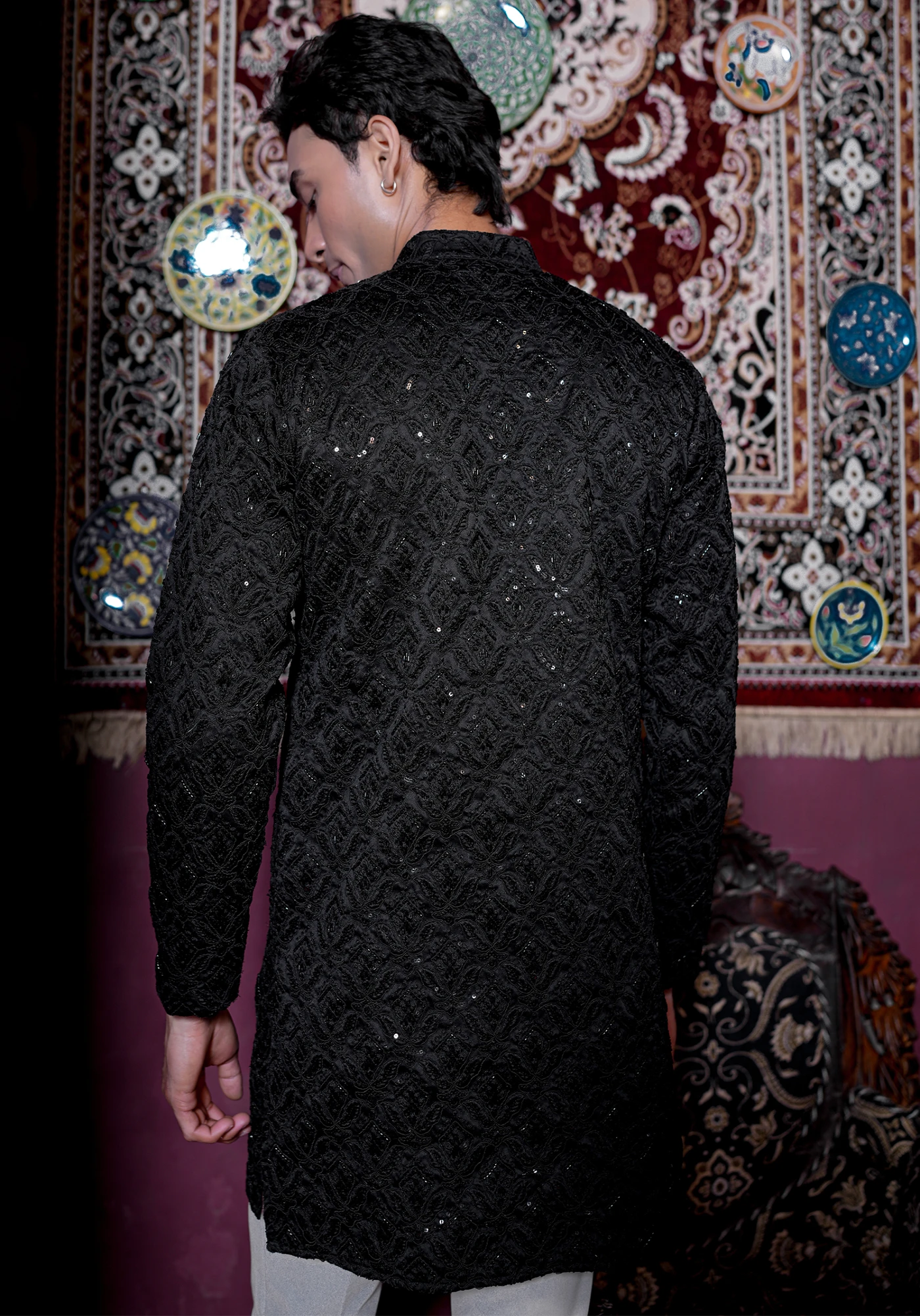 Make a bold and refined statement with this Black Sequin Embroidered Designer Kurta, crafted for men who appreciate luxury with modern sophistication. Designed in a rich textured fabric with intricate tonal embroidery and subtle sequin detailing, this kurta exudes effortless elegance perfect for evening celebrations.
