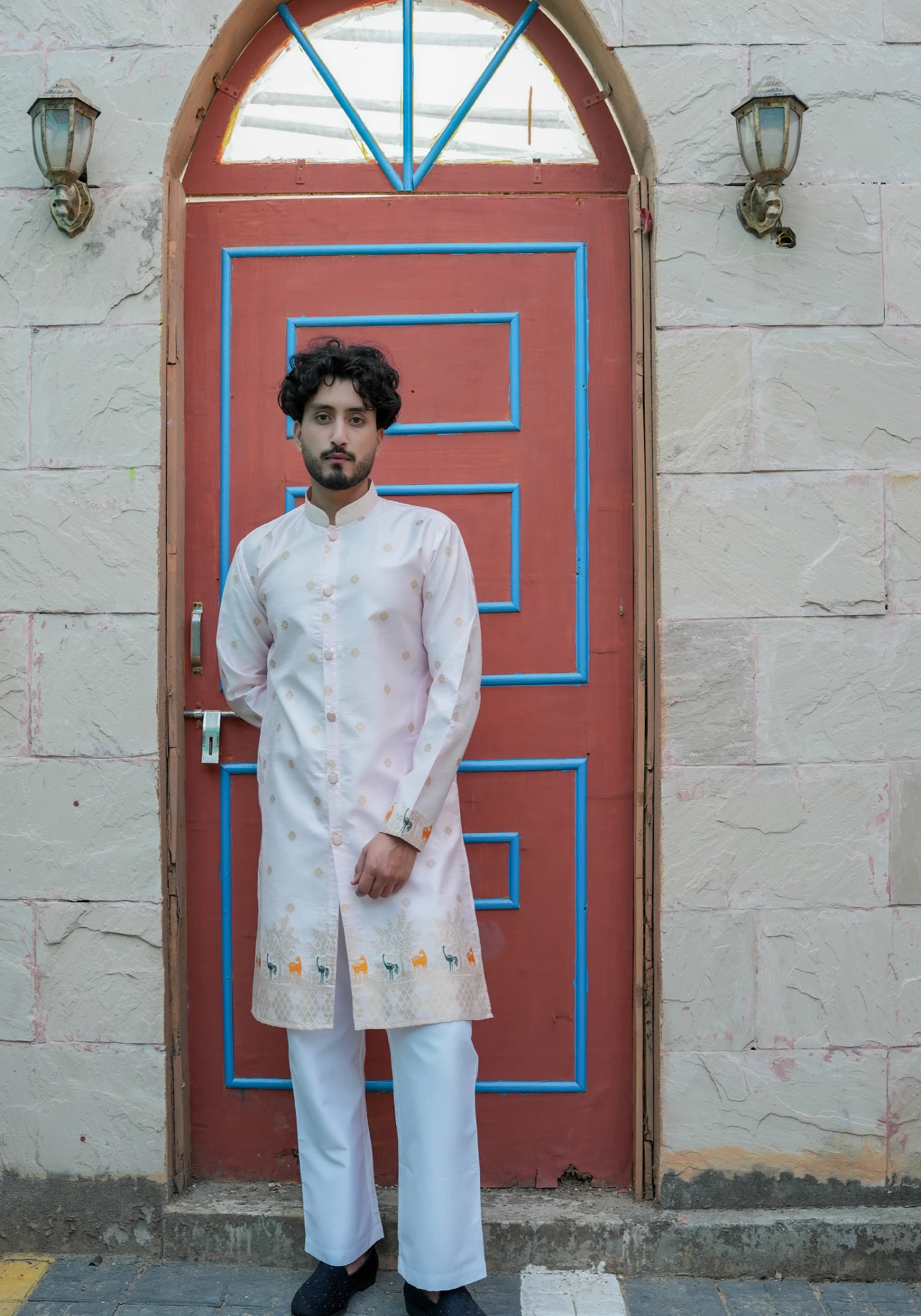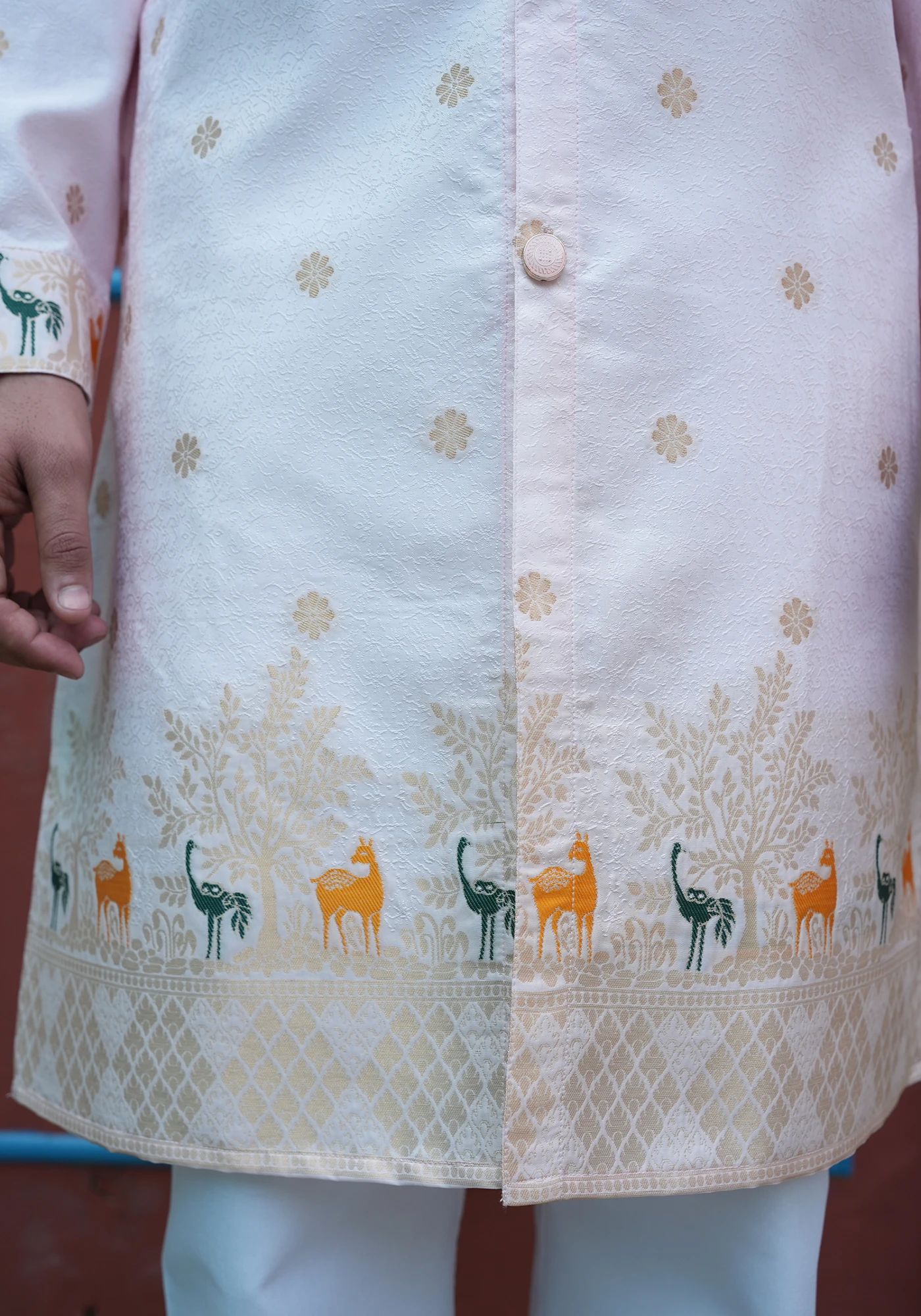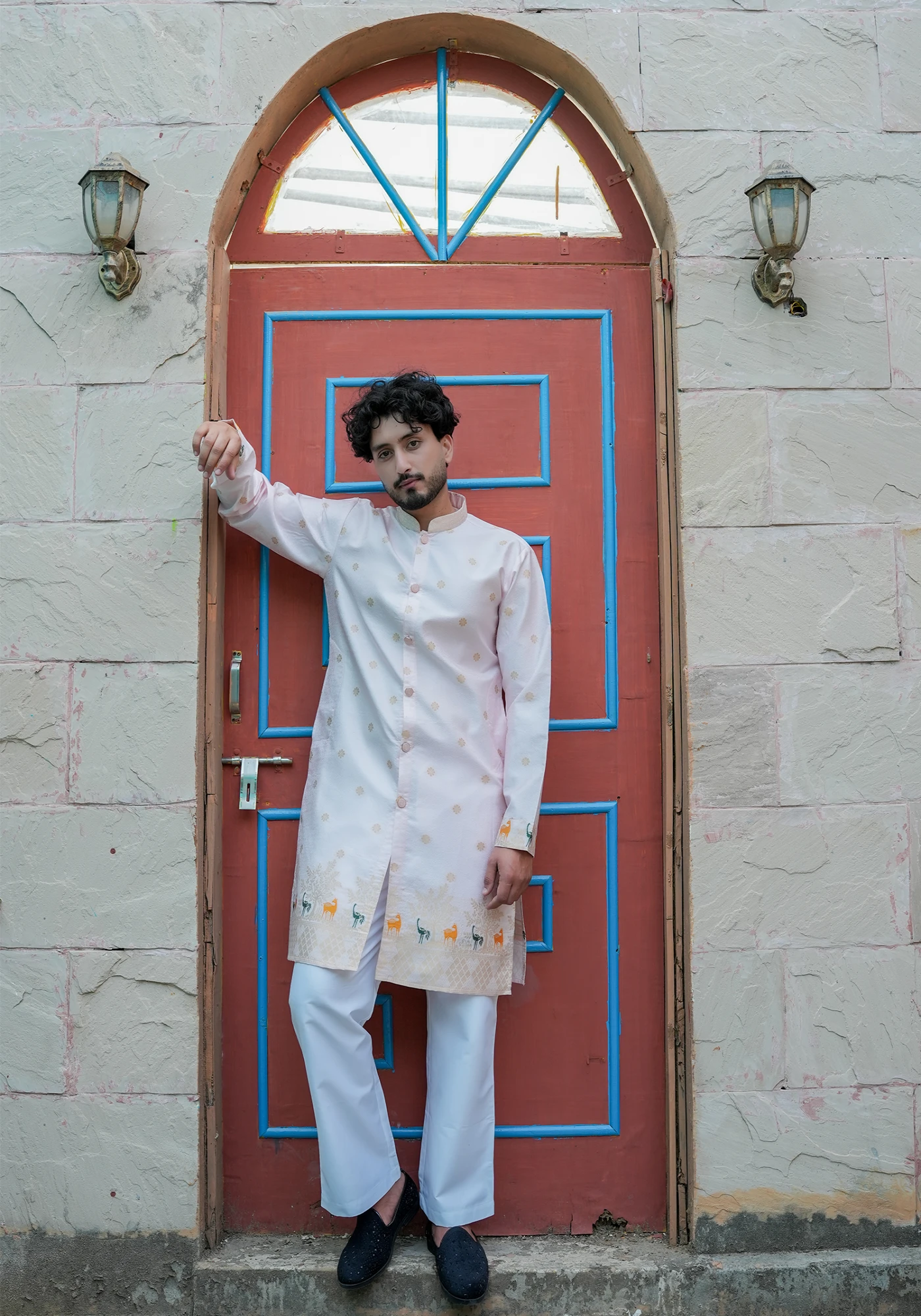 ο»ΏFresh, vibrant, and effortlessly stylish β this Pink Jacquard Designer Kurta brings a modern twist to traditional ethnic wear. The soft lavender base is enhanced with subtle gold motifs and distinctive artistic detailing along the hem and cuffs, adding a playful yet refined character. Tailored in a sleek front-button silhouette, it offers a contemporary appeal while maintaining festive elegance. Perfect for daytime celebrations, festive gatherings, and cultural events, this kurta delivers comfort with standout charm.