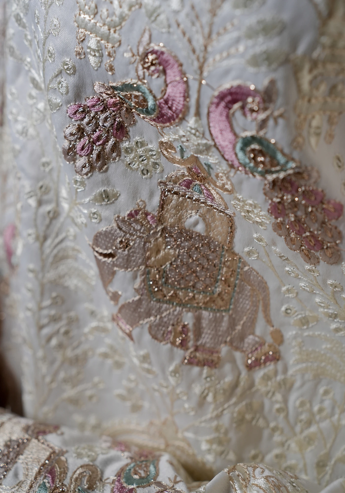 The intricate heritage-inspired motifs woven across the fabric add depth and sophistication, making it an ideal choice for weddings, engagements, receptions, and festive occasions. The subtle interplay of ivory with muted tones creates a refined statement look — perfect for day and evening functions alike.