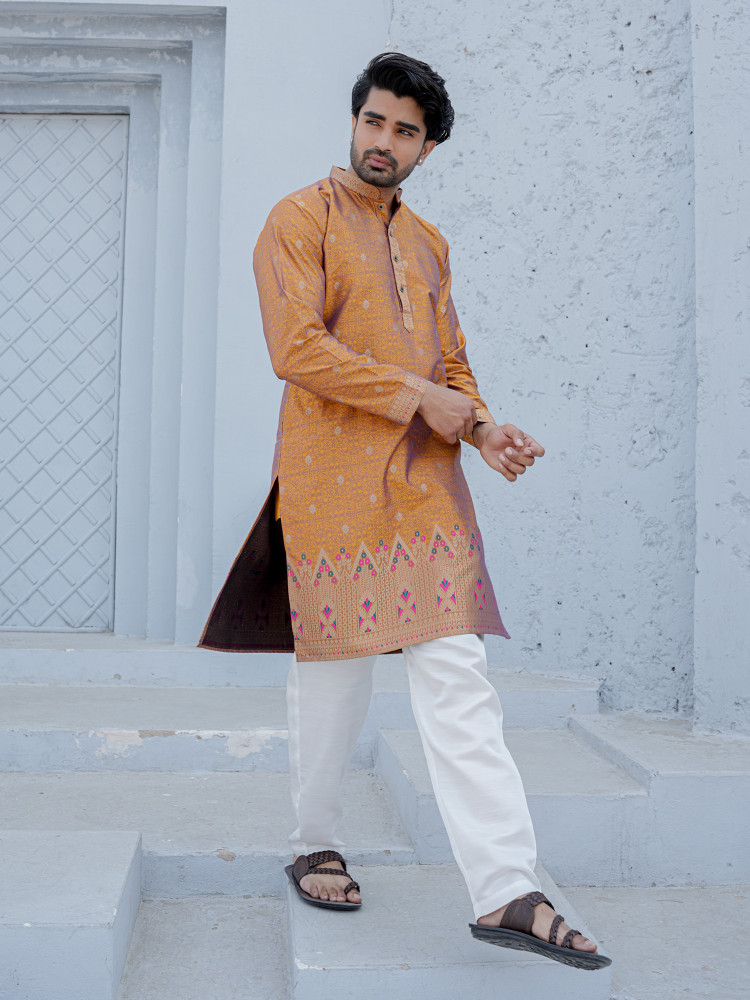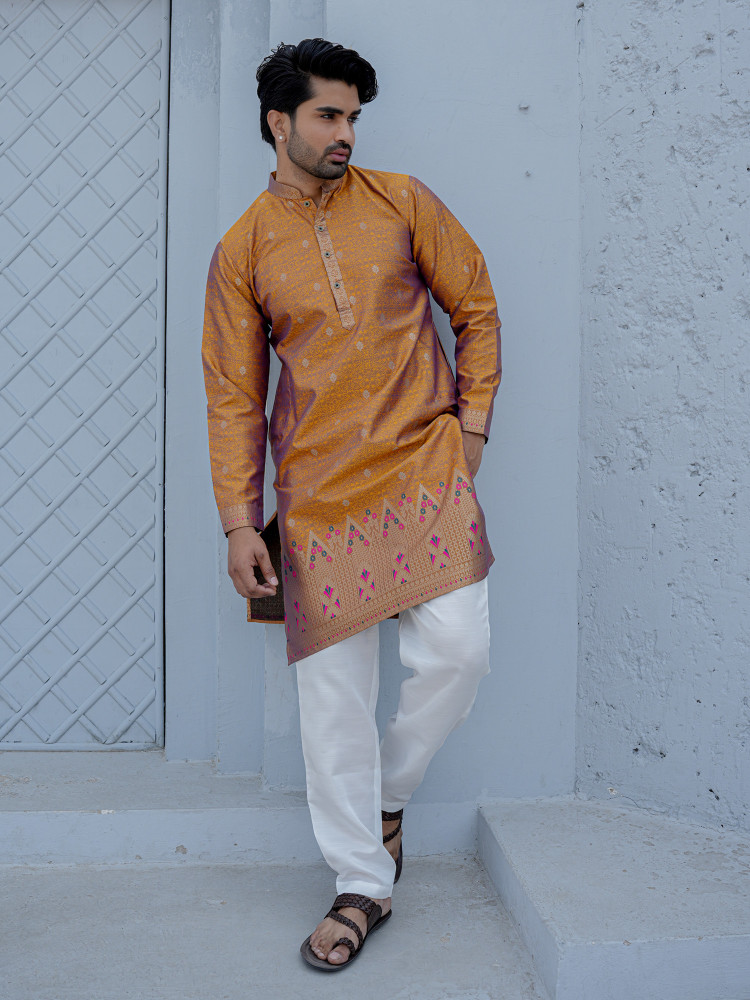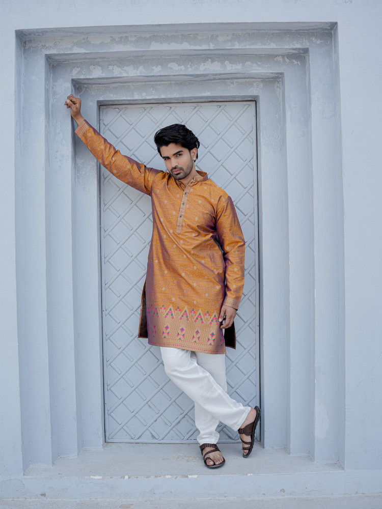 Elegant, minimal, and festive-ready — this Mustard Jacquard Designer Kurta reflects timeless ethnic sophistication. The soft cream base is enhanced with delicate woven motifs that create a subtle textured richness, while the intricately designed ethnic border at the hem adds a graceful traditional accent. Tailored in a clean straight silhouette with a classic mandarin collar and button placket, this kurta offers a perfect balance of understated luxury and modern refinement. Ideal for festive gatherings, wedding functions, and cultural celebrations, it ensures comfort with effortless style.