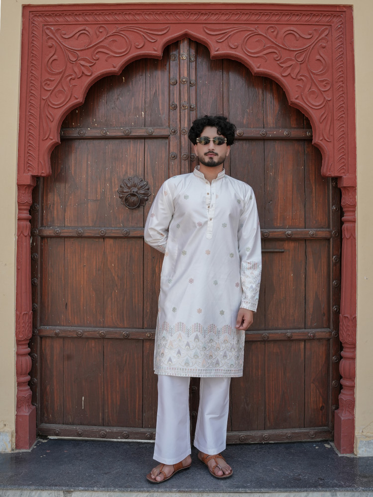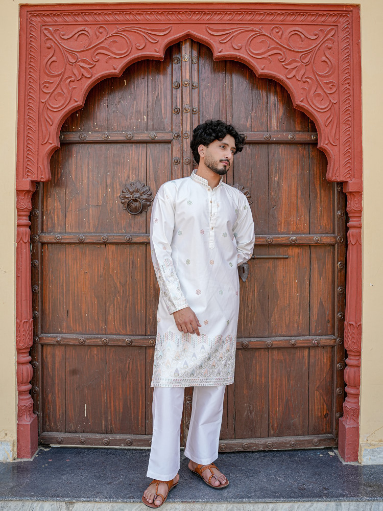 Graceful and refined, this Cream Silk Blend Designer Kurta exudes timeless festive sophistication with a subtle contemporary charm. The soft cream tone creates an elegant base, enhanced with delicate multicolour woven motifs that add understated richness to the look. Intricate ethnic border detailing along the hem and coordinated sleeve accents lend a traditional handcrafted appeal, while the clean mandarin collar and structured silhouette ensure a modern polished finish. Ideal for weddings, festive celebrations, and cultural gatherings, this kurta offers luxurious comfort with effortless style. A versatile piece designed to elevate any ethnic wardrobe with quiet elegance.