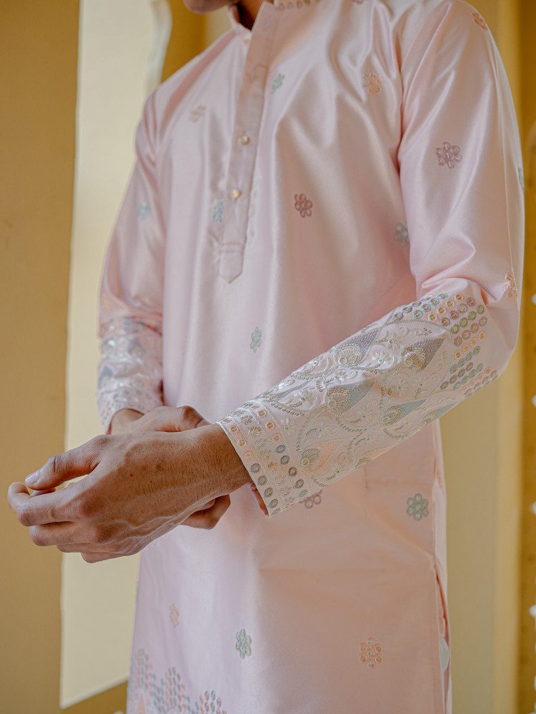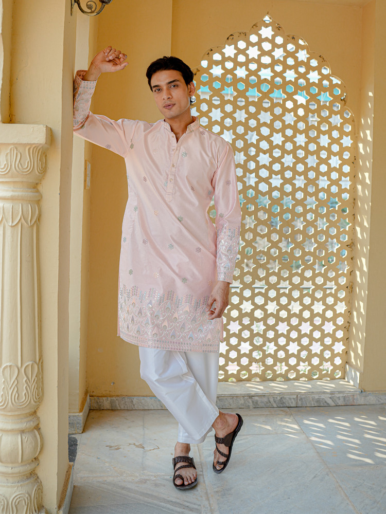 Men’s Pink Silk Blend Embroidered Kurta with with Detailed Hem Design