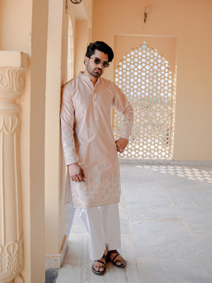 Graceful and refined, this Pink Silk Blend Designer Kurta exudes timeless festive sophistication with a subtle contemporary charm. The soft pink tone creates an elegant base, enhanced with delicate multicolour woven motifs that add understated richness to the look. Intricate ethnic border detailing along the hem and coordinated sleeve accents lend a traditional handcrafted appeal, while the clean mandarin collar and structured silhouette ensure a modern polished finish. Ideal for weddings, festive celebrations, and cultural gatherings, this kurta offers luxurious comfort with effortless style. A versatile piece designed to elevate any ethnic wardrobe with quiet elegance.