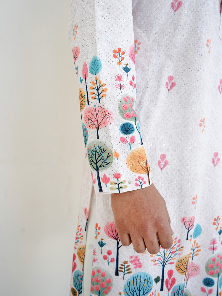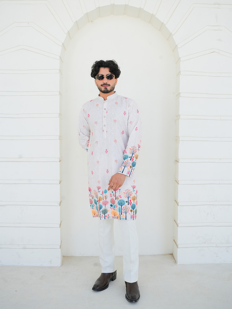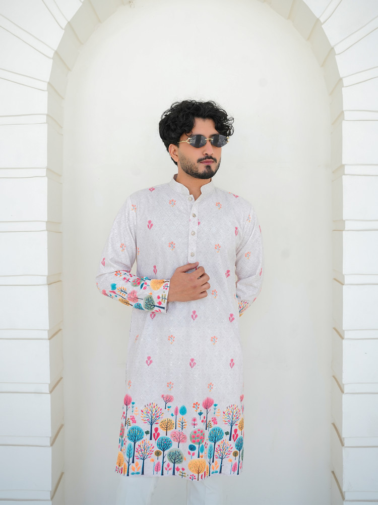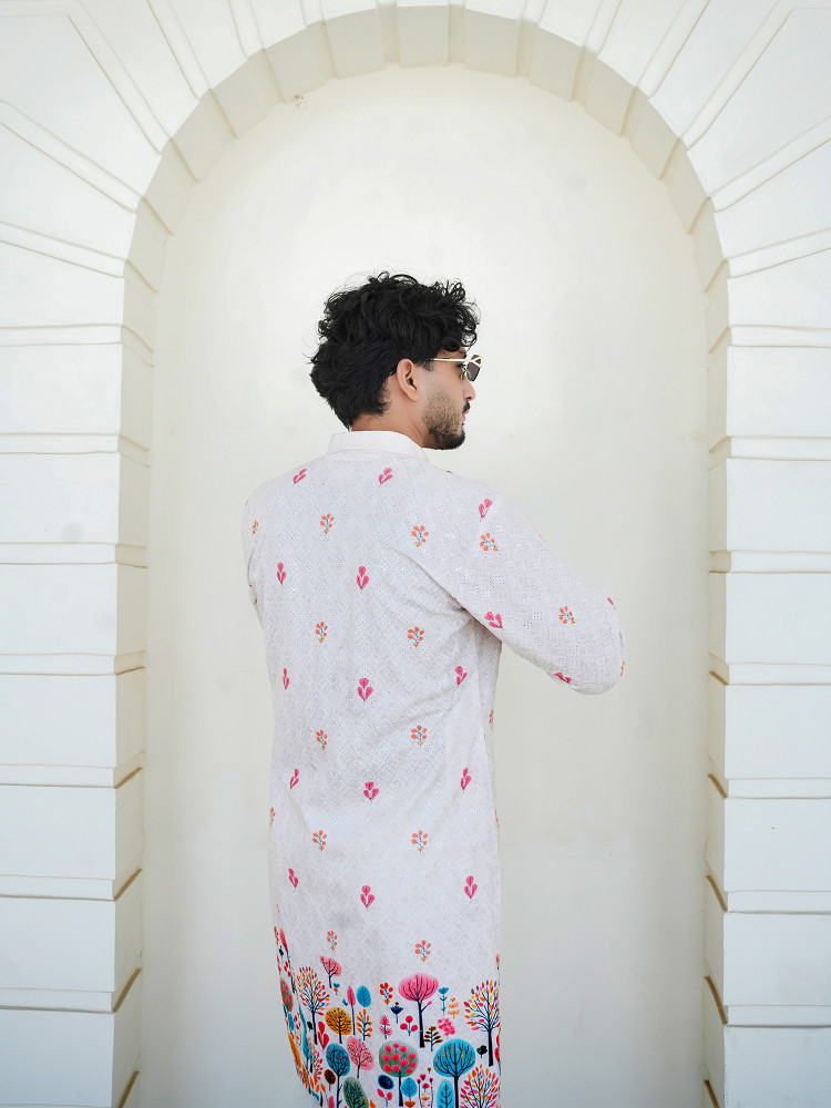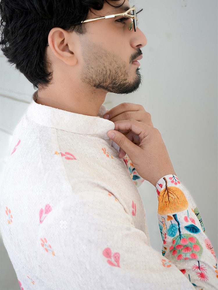 The clean off-white base enhances the intricate detailing, while the colorful botanical design adds a fresh and contemporary touch. Tailored with a mandarin collar and a comfortable fit, this kurta ensures style and ease for long festive occasions.