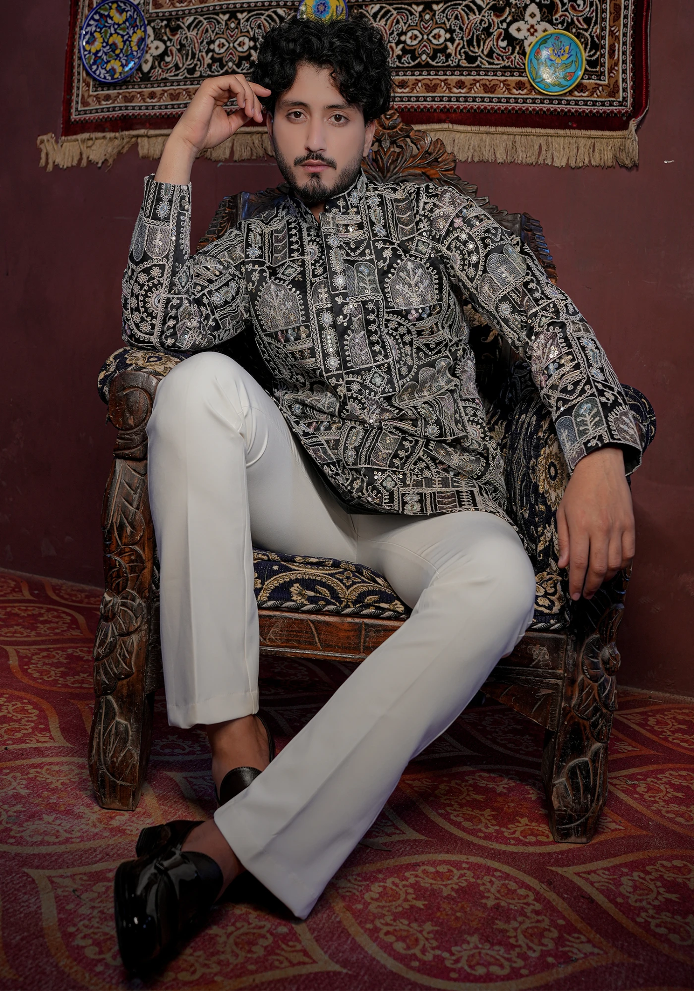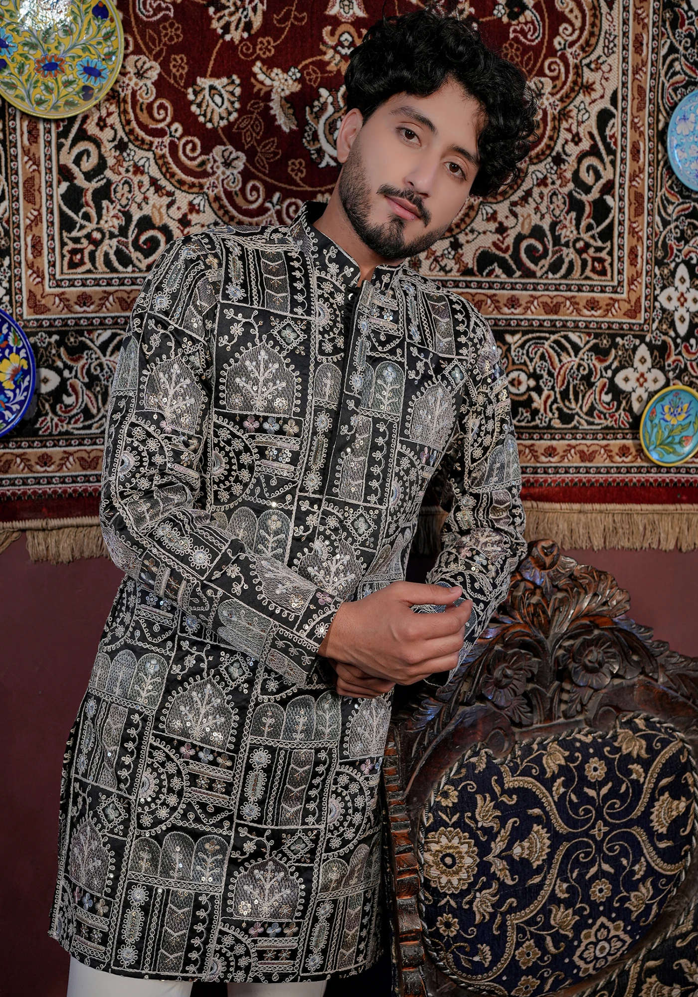 Pair this kurta with ivory or off-white trousers and classic mojris for a royal festive look, or style with black pants for a bold evening ensemble.
