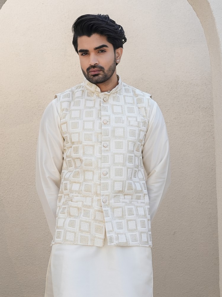 Timeless and refined, this Ivory Kurta Set with Textured Nehru Jacket is designed for effortless festive elegance. The soft ivory kurta creates a clean, sophisticated base, while the intricately woven jacket adds subtle texture and dimension. Crafted in a modern tailored silhouette, this ensemble blends traditional charm with contemporary styling. Perfect for weddings, engagements, and celebratory occasions, it offers a polished look that speaks of quiet luxury.