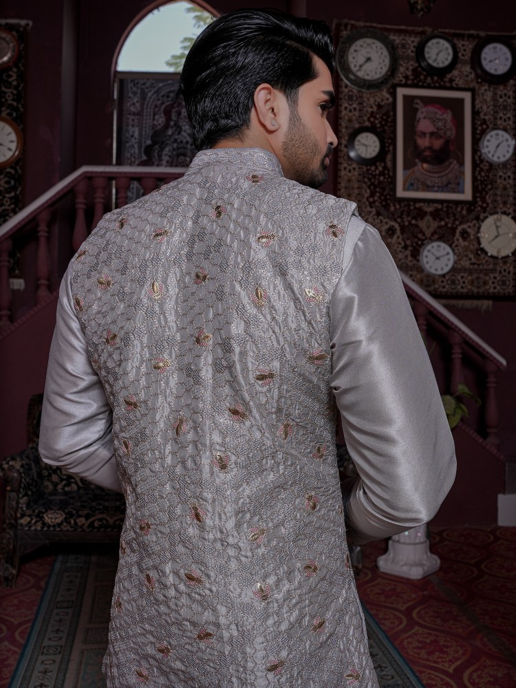Gracefully refined and timeless in appeal, this Kurta Set with Embroidered Nehru Jacket is crafted for sophisticated celebrations. The soft taupe kurta offers a smooth, lustrous base, perfectly complemented by a delicately embroidered jacket featuring intricate woven patterns and subtle embellishments. Designed in a modern tailored silhouette, this ensemble balances understated luxury with traditional craftsmanship. Ideal for weddings, receptions, and festive gatherings, it delivers effortless elegance with a distinguished presence.