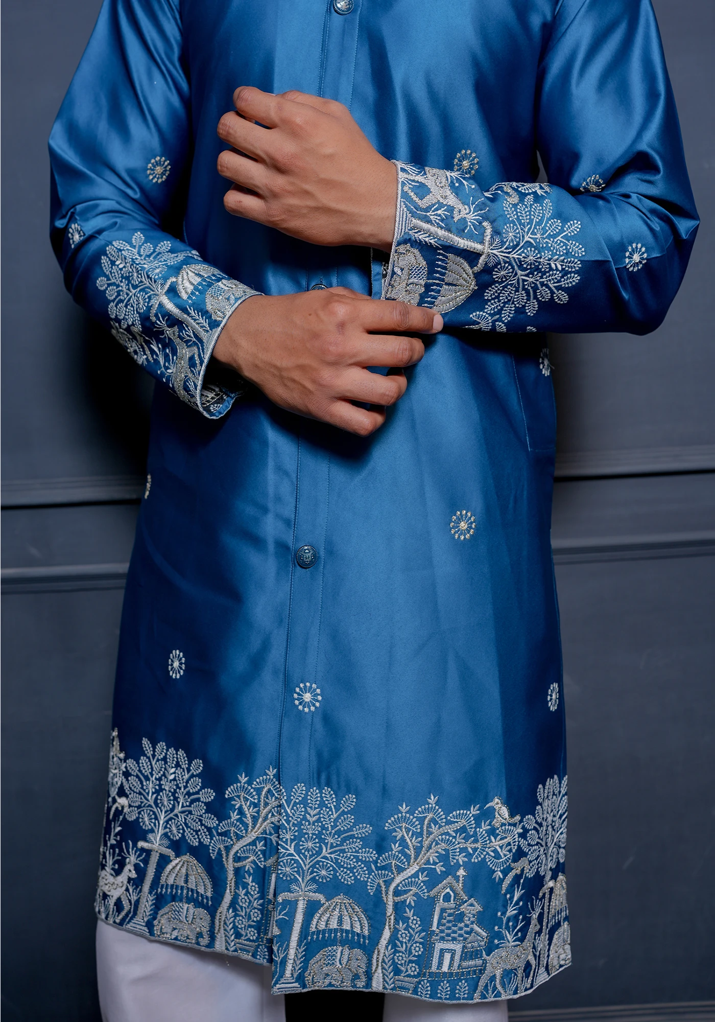 Bold yet refined, this Teal Blue Embroidered Designer Kurta is crafted for men who appreciate statement elegance. The rich teal base is enhanced with intricate ivory-toned embroidery along the cuffs and hem, creating a striking contrast that exudes royal charm. Designed in a structured, modern silhouette with a front buttoned placket, it blends traditional artistry with contemporary sophistication. Perfect for weddings, receptions, and grand festive occasions, this kurta ensures a polished and commanding presence.