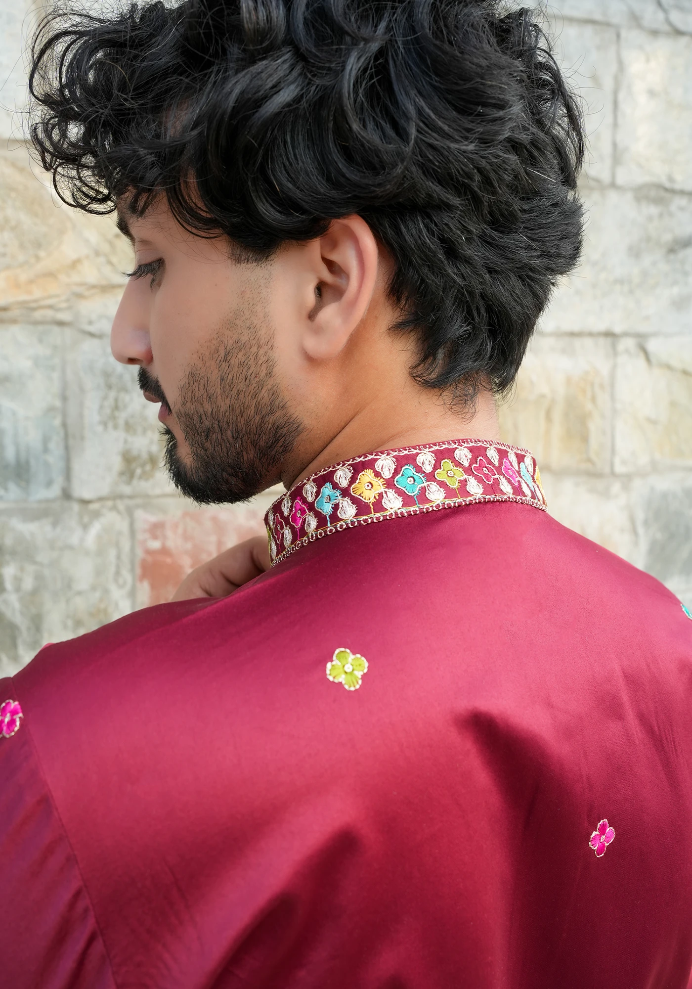 Make a bold style statement with this Maroon Front Open Indo-Western Kurta, designed for modern festive elegance. Featuring a structured front-open silhouette, this design blends traditional ethnic charm with contemporary jacket-style tailoring. The rich black base is enhanced with intricate multicolor embroidery along the sleeves and hem, creating a striking visual appeal. Crafted for both comfort and sophistication, it offers a sharp tailored fit ideal for weddings, receptions, and festive celebrations. Perfect for men who prefer standout ethnic fashion with a modern edge.