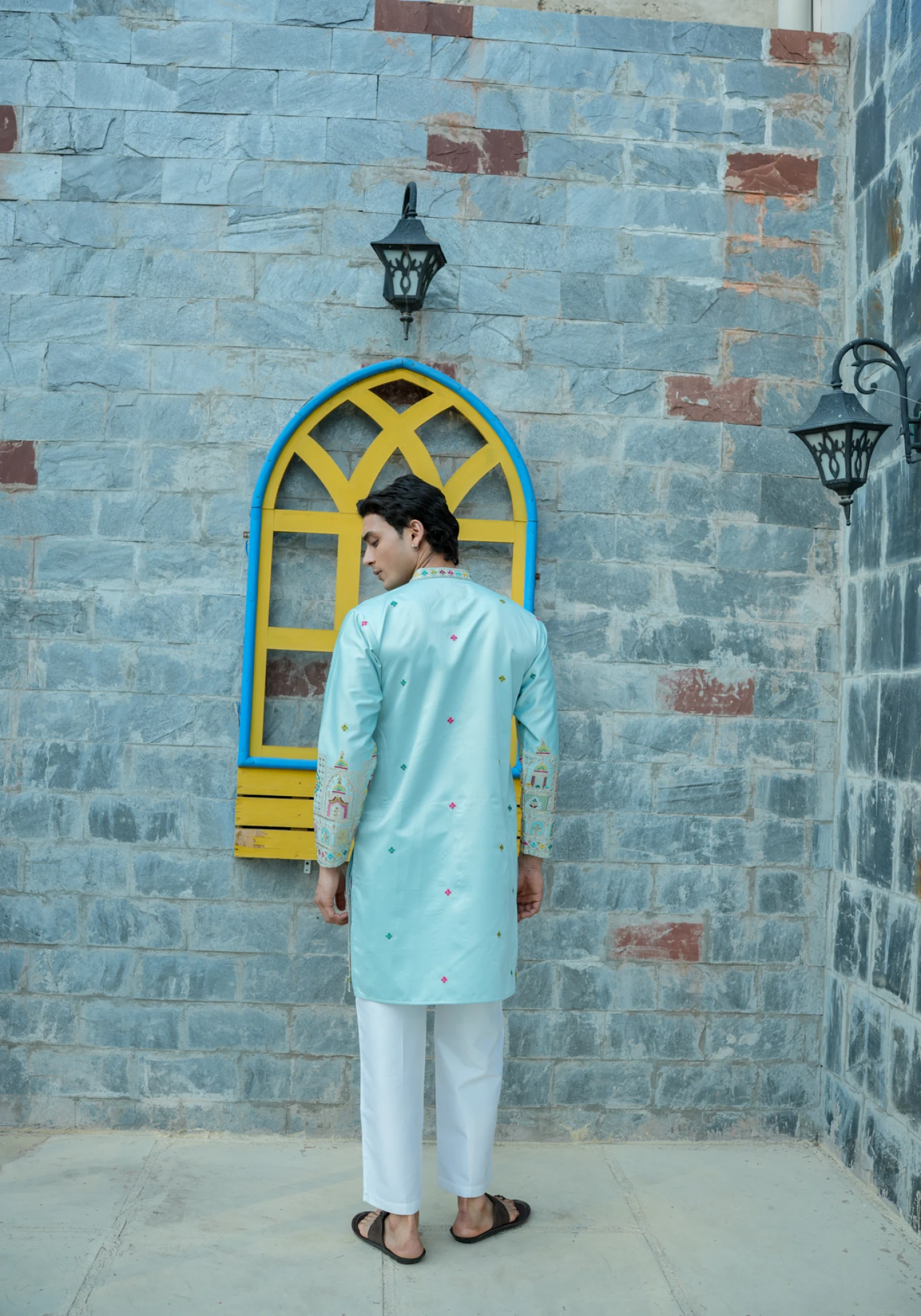Make a bold style statement with this Skyblue Front Open Indo-Western Kurta, designed for modern festive elegance. Featuring a structured front-open silhouette, this design blends traditional ethnic charm with contemporary jacket-style tailoring. The rich black base is enhanced with intricate multicolor embroidery along the sleeves and hem, creating a striking visual appeal. Crafted for both comfort and sophistication, it offers a sharp tailored fit ideal for weddings, receptions, and festive celebrations. Perfect for men who prefer standout ethnic fashion with a modern edge.