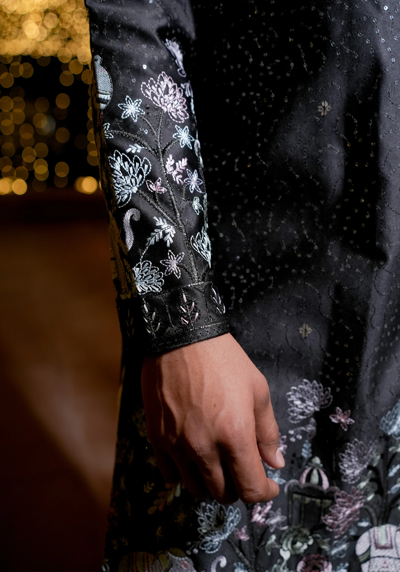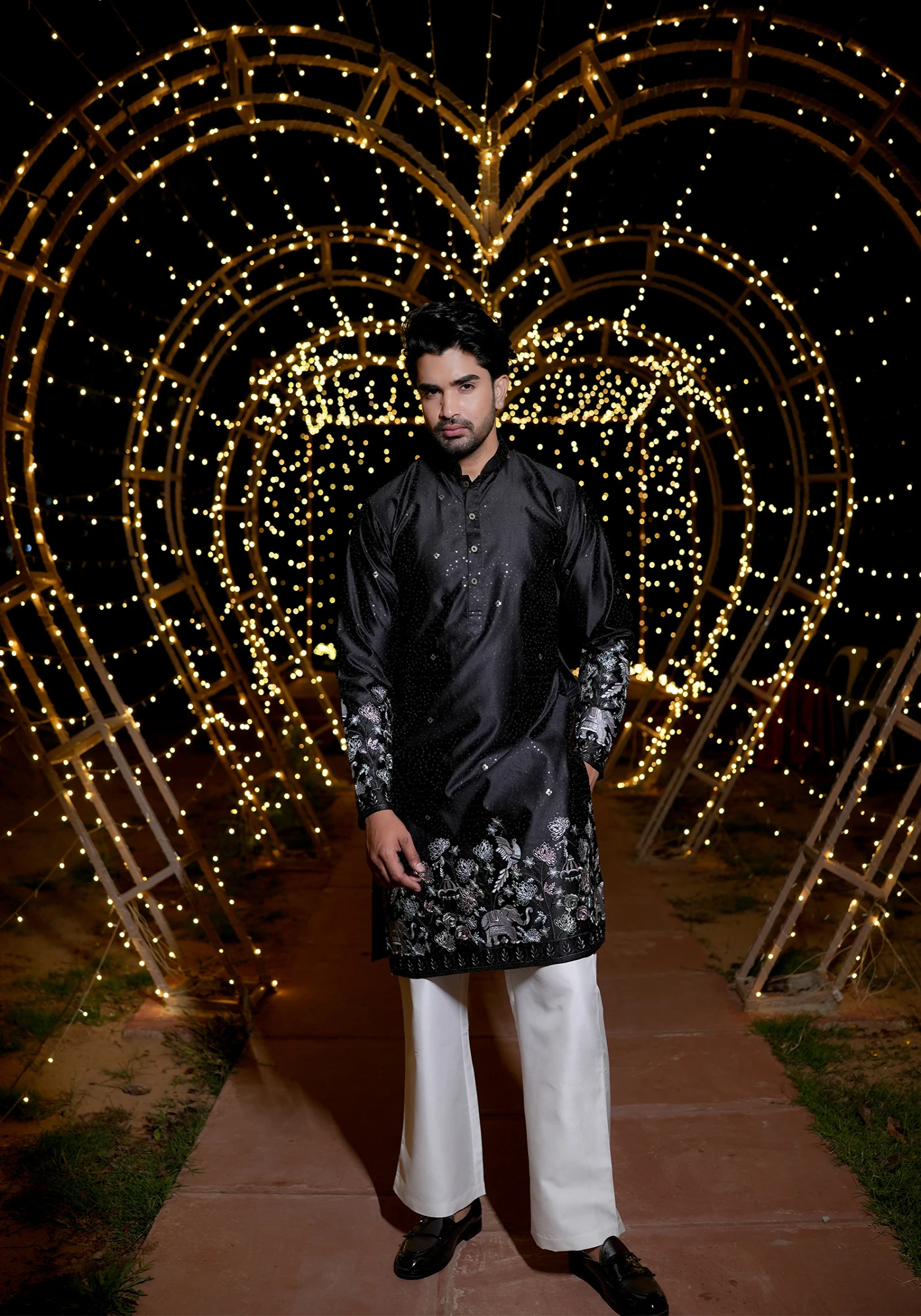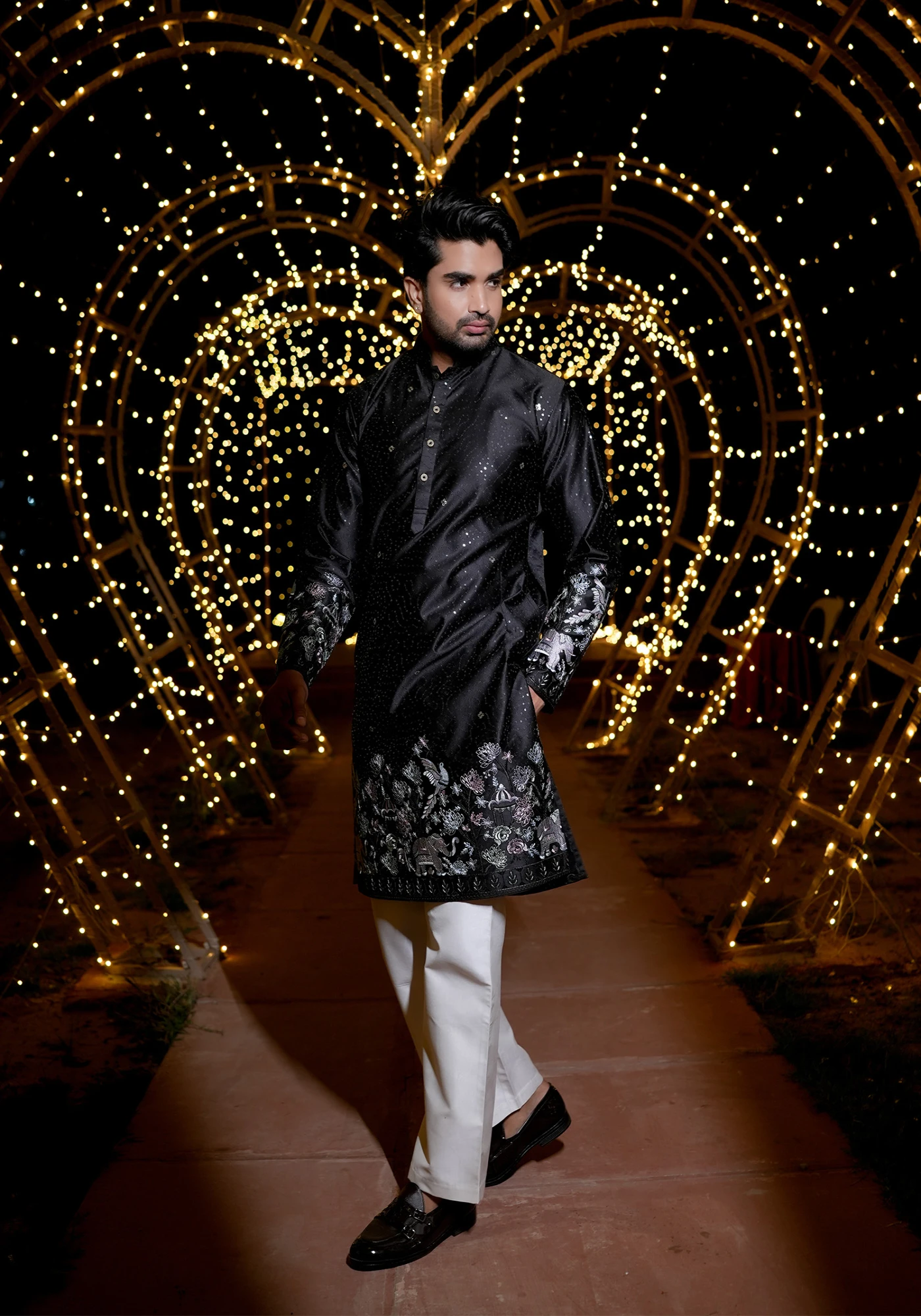 A refined expression of modern elegance, this black designer kurta showcases intricate embroidery on a rich textured base. Crafted for sophisticated celebrations, it blends timeless craftsmanship with contemporary festive luxury.
