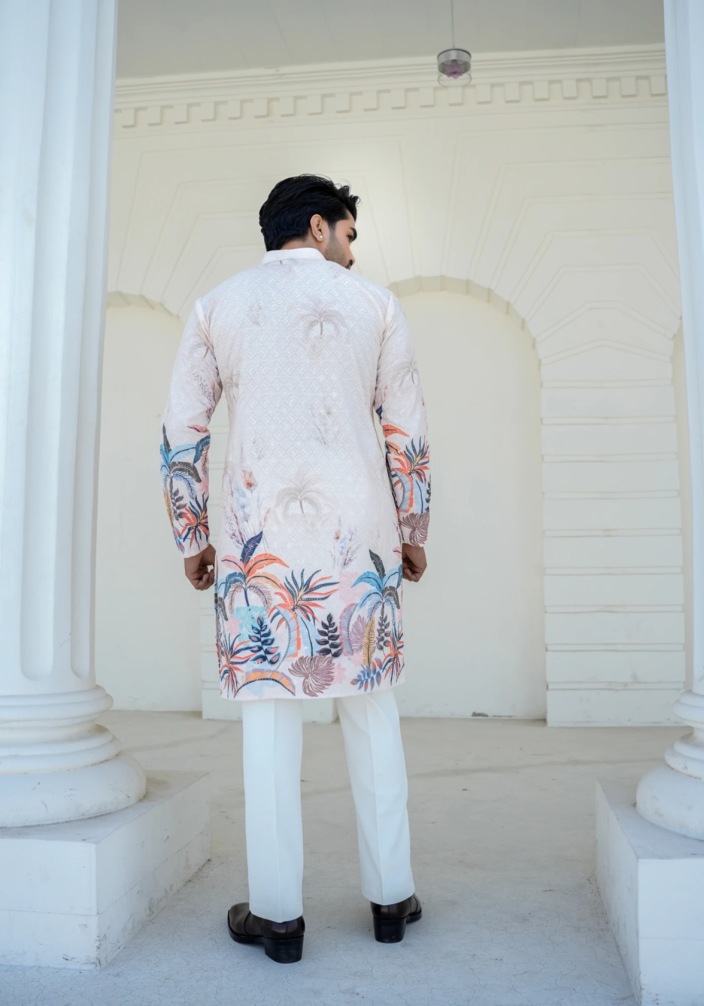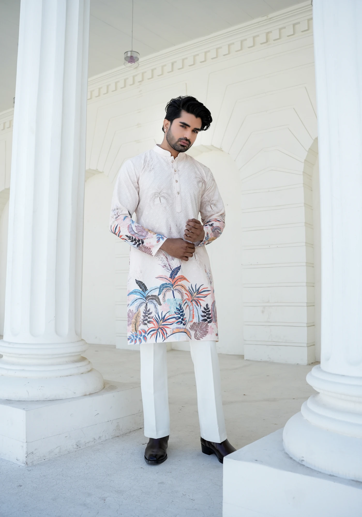 Fresh, artistic, and effortlessly refined β this Off-White Rayon Schiffali Digital Print Kurta is designed for modern festive elegance. Crafted in soft and breathable rayon fabric, it features vibrant digital print detailing inspired by botanical motifs, creating a striking yet sophisticated look. The clean silhouette and subtle textured base balance the bold print, making it perfect for daytime celebrations, festive gatherings, and special occasions. Lightweight and comfortable, this kurta ensures ease of movement while maintaining a sharp, polished appearance.