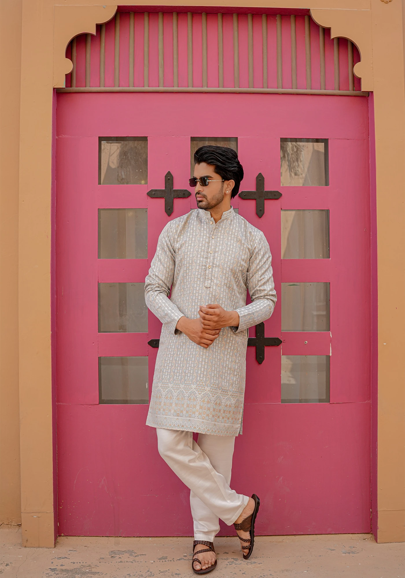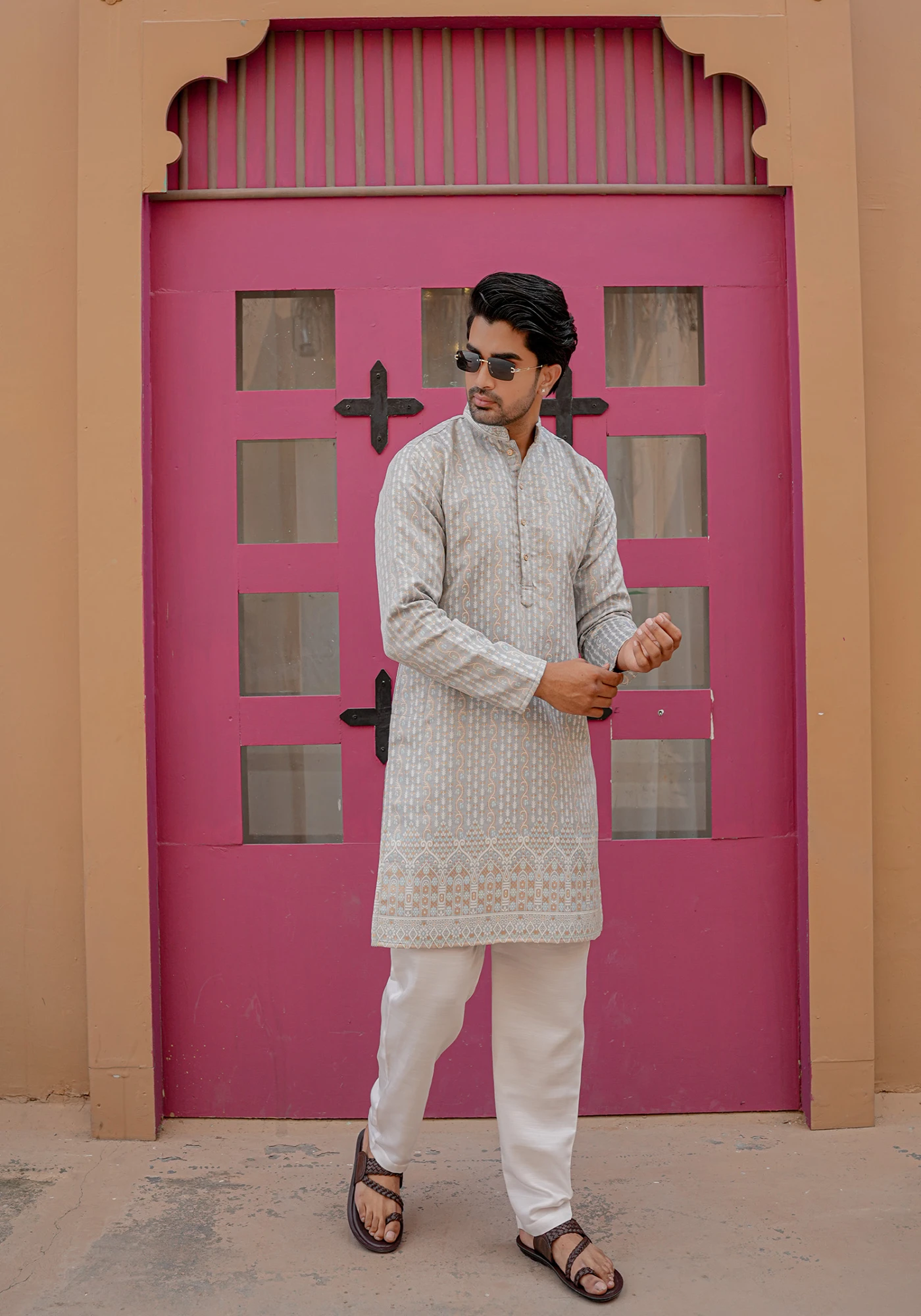 Pair with ivory or off-white trousers and tan mojris for a fresh daytime festive look with understated elegance.