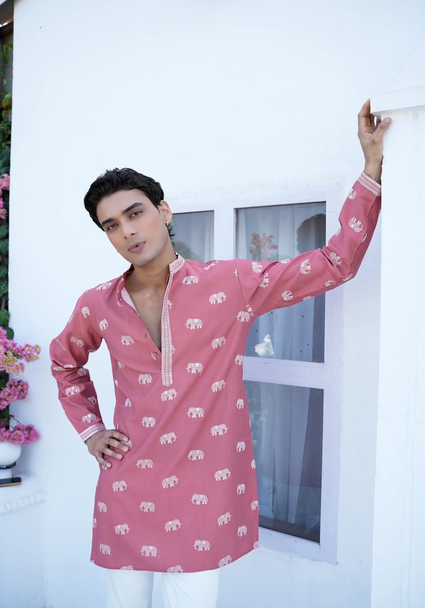 Playful yet refined, this Rose Pink Elephant Print Kurta brings a fresh twist to traditional menswear. Crafted in a soft, breathable fabric, it features charming elephant motifs across the body, complemented by subtle contrast detailing along the neckline and cuffs. The relaxed yet tailored silhouette makes it perfect for daytime festivities, cultural celebrations, and pre-wedding functions. Designed for comfort and effortless style, this kurta adds personality while maintaining a polished festive appeal.