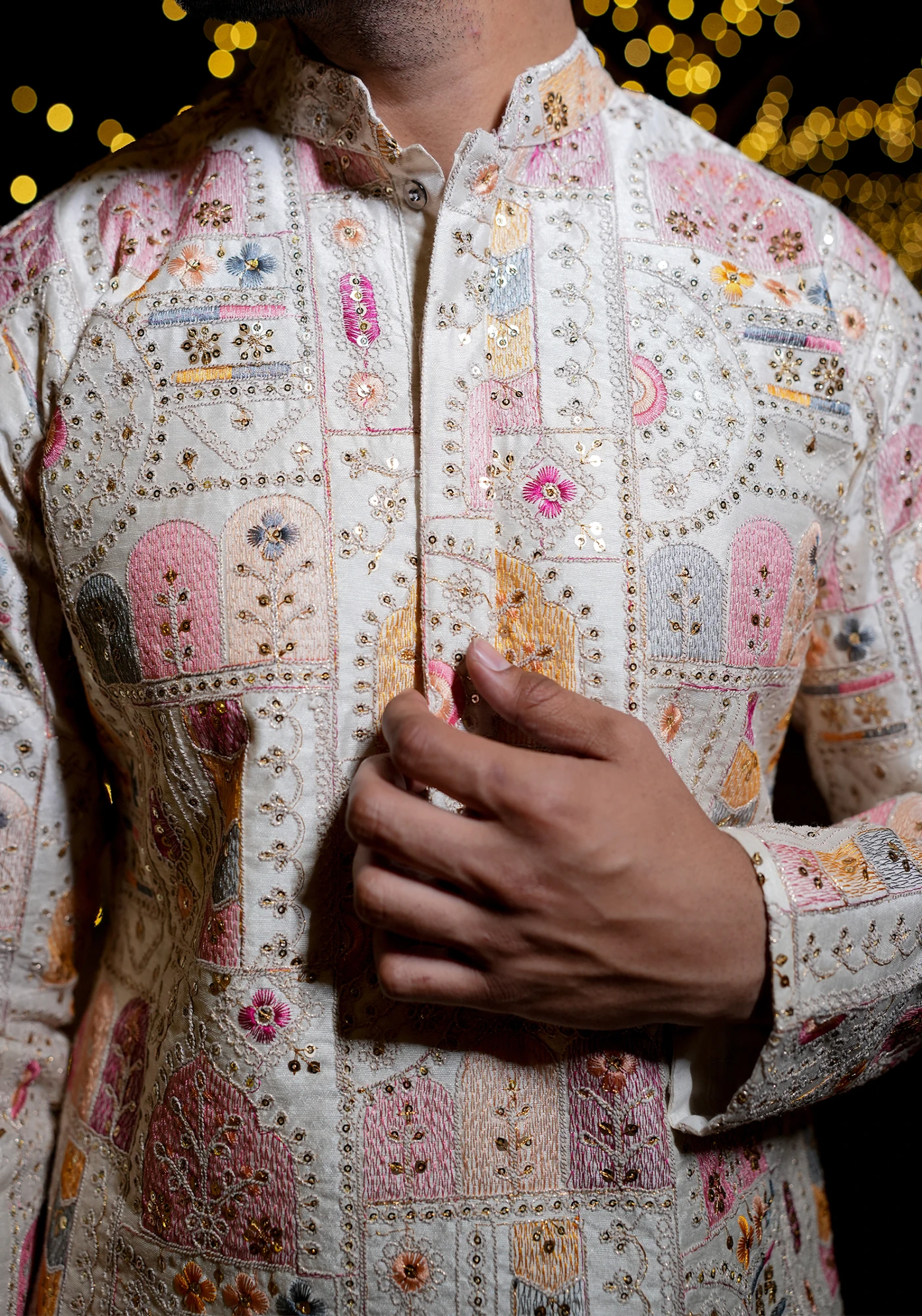 Pair it with ivory or white trousers and classic mojris for a royal wedding-ready look, or elevate it further with a contrasting stole for grand occasions.