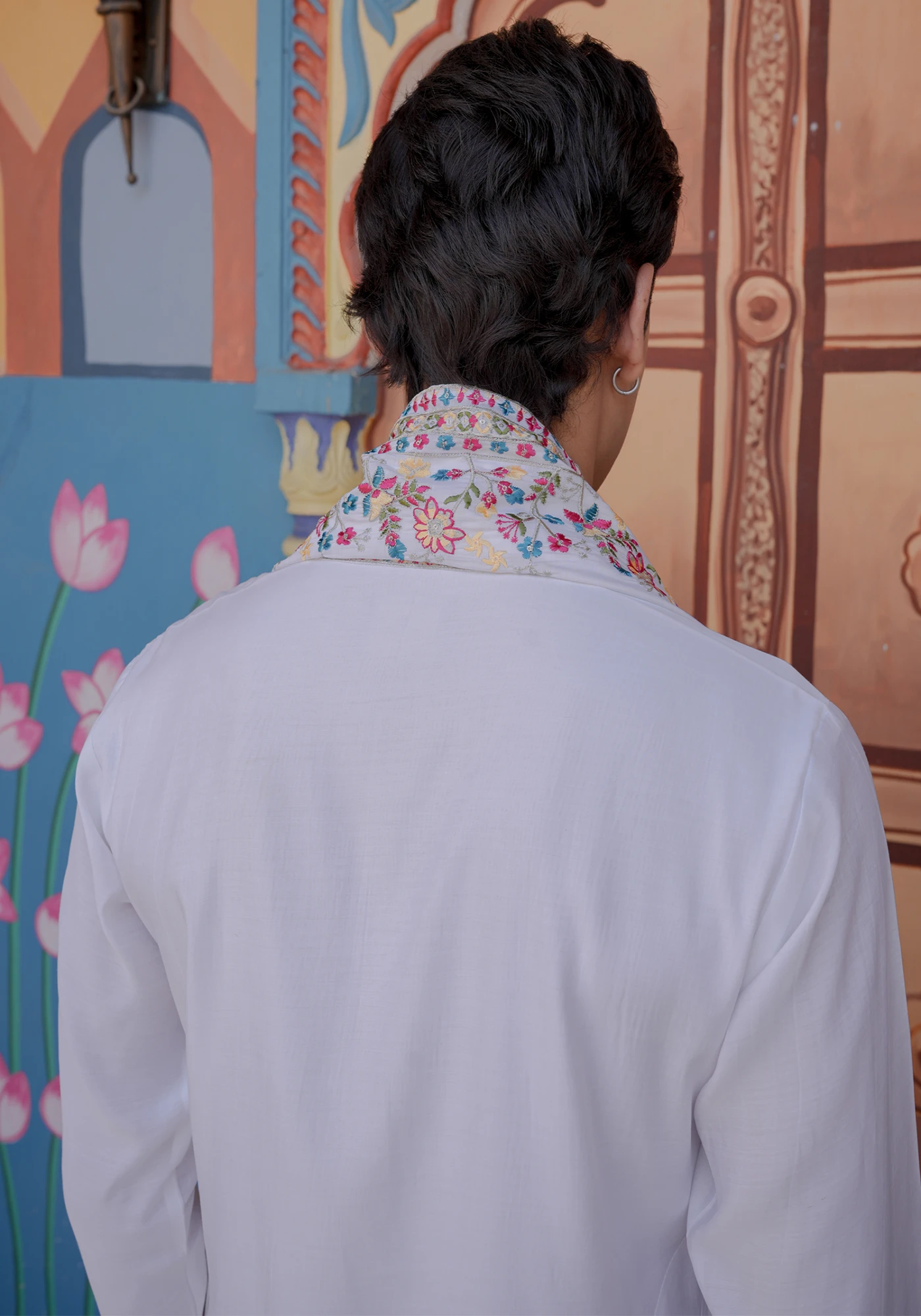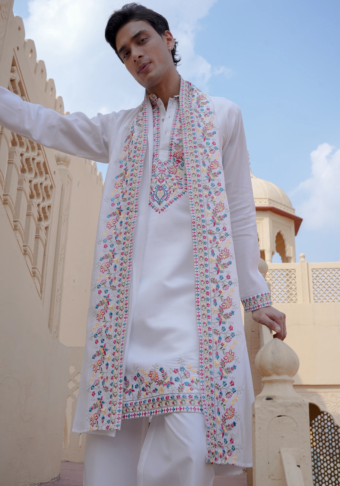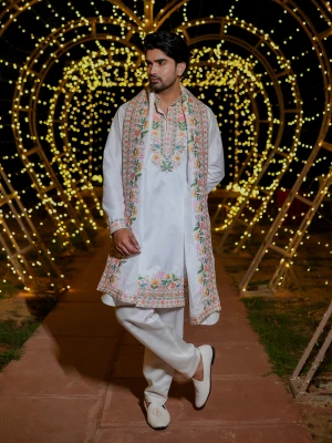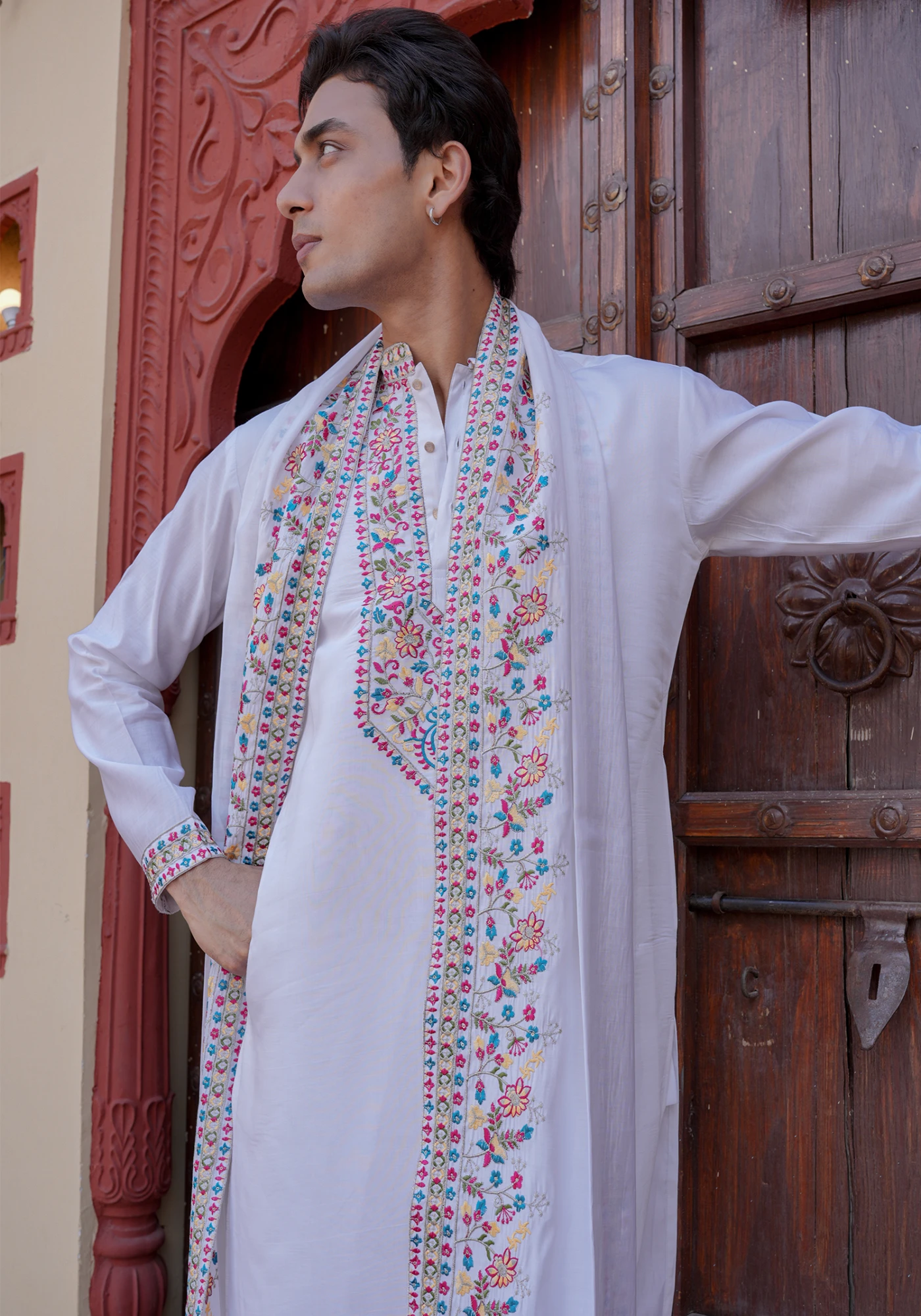 Graceful and celebration-ready, this Ivory Kurta Pant with Embroidered Dupatta Set embodies timeless festive elegance. The soft ivory base is beautifully enhanced with vibrant multicolor embroidery along the neckline, cuffs, hem, and coordinated dupatta, creating a rich yet refined statement. Designed in a clean, modern silhouette, this ensemble blends traditional craftsmanship with contemporary sophistication. Perfect for weddings, festive gatherings, and cultural ceremonies, it delivers a regal look with effortless charm.