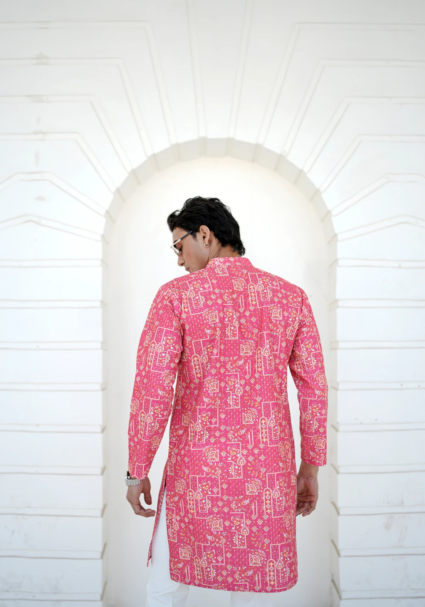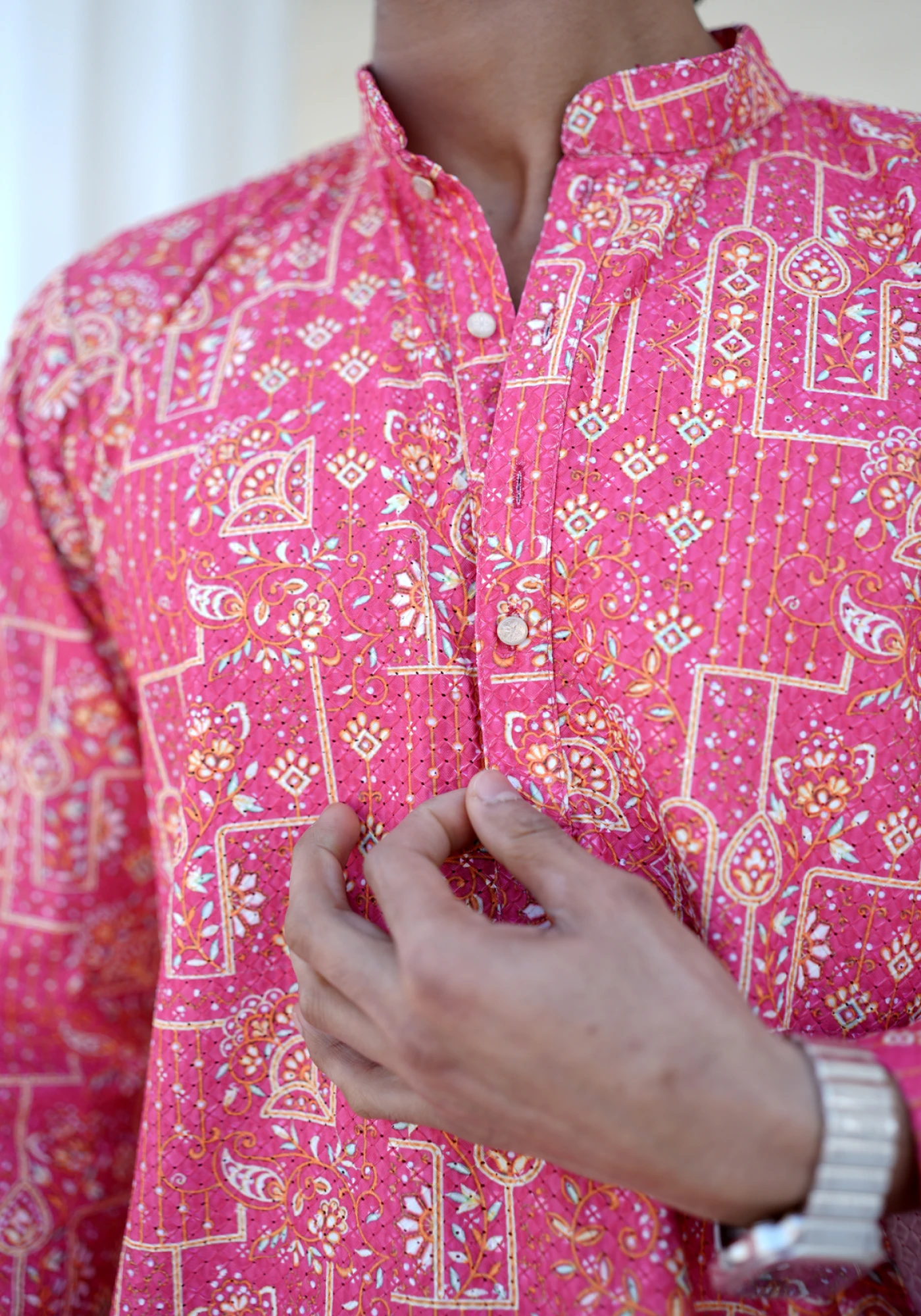 Bold, vibrant, and unapologetically festive β this Hot Pink Heritage Print Kurta is designed for those who love to stand out. Featuring intricate all-over traditional-inspired prints, this piece blends cultural artistry with a sharp, modern silhouette. The striking pink base adds energy and celebration-ready charm, making it ideal for haldi functions, mehendi ceremonies, and festive gatherings. Crafted for comfort and impact, it delivers effortless style with a confident edge.