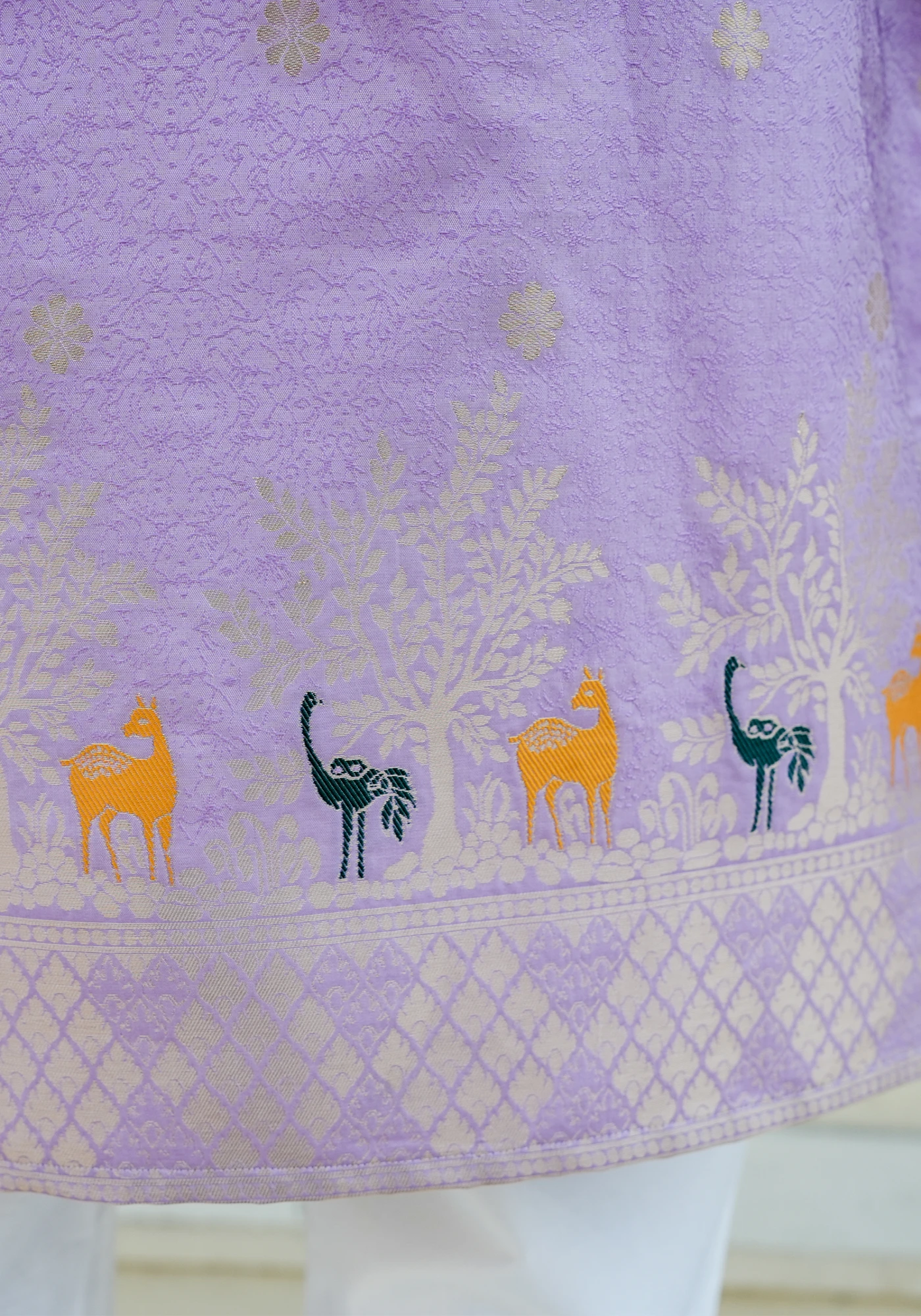 Crafted in rich jacquard fabric, this Lavender Kurta with Coordinated Jacket Set blends traditional artistry with modern festive elegance. The intricate woven patterns and heritage-inspired motifs add depth and texture, while the structured jacket enhances the overall regal appeal.