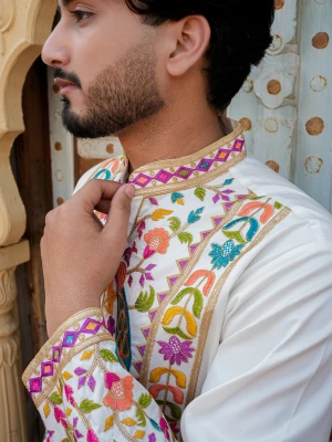 Pair with crisp white trousers and traditional sandals or mojris to highlight the vibrant embroidery and complete the festive look.