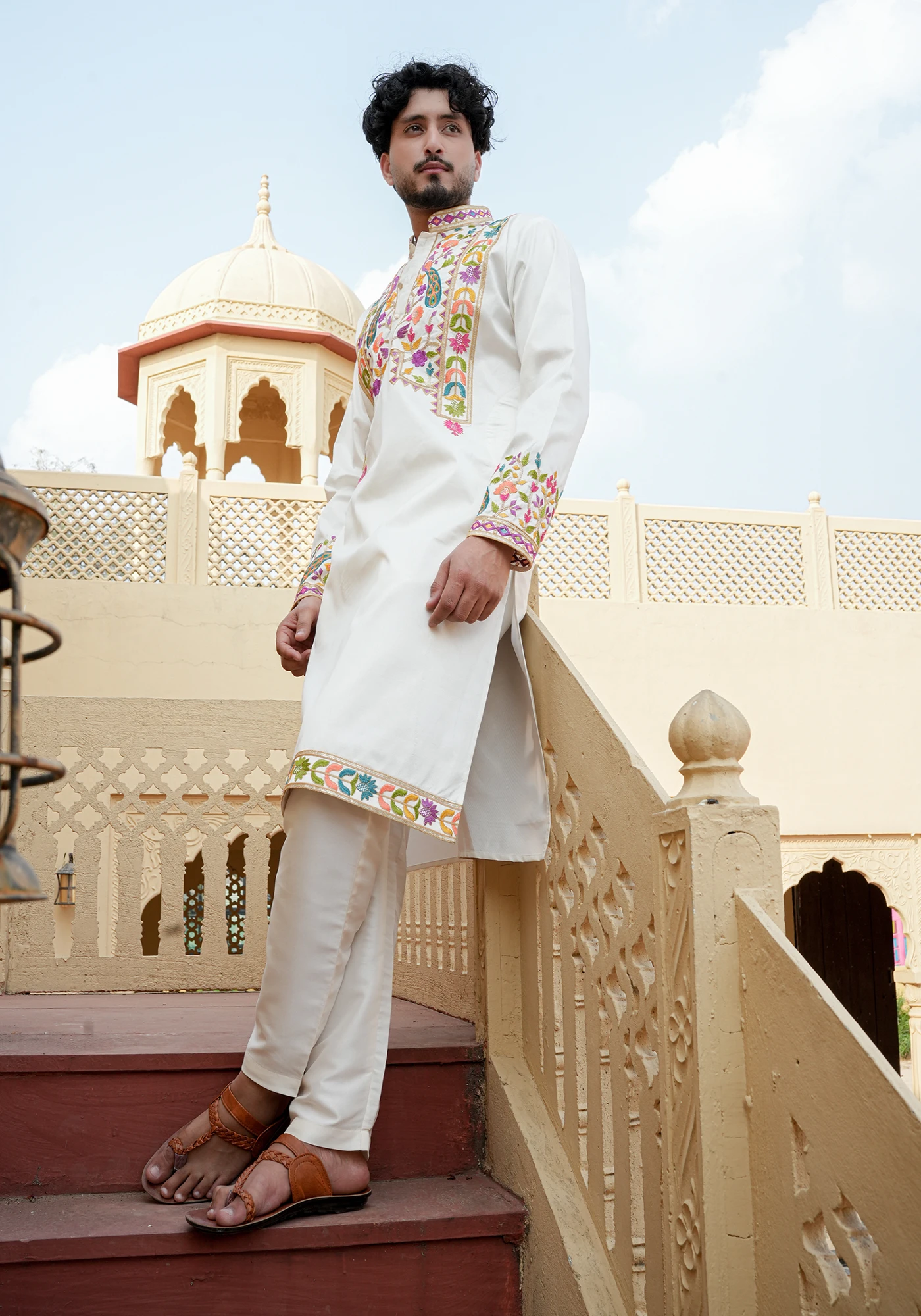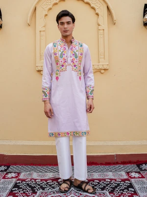 Vibrant, artistic, and celebration-ready β this White Multicolor Embroidered Kurta is crafted to make a refined festive statement. The soft lilac base is beautifully enhanced with intricate, colorful embroidery along the neckline, cuffs, and hem, adding rich cultural character and visual depth. Designed in a clean, modern silhouette, it blends traditional craftsmanship with contemporary elegance. Perfect for festive gatherings, mehendi functions, and cultural celebrations, this kurta delivers standout charm with effortless sophistication.