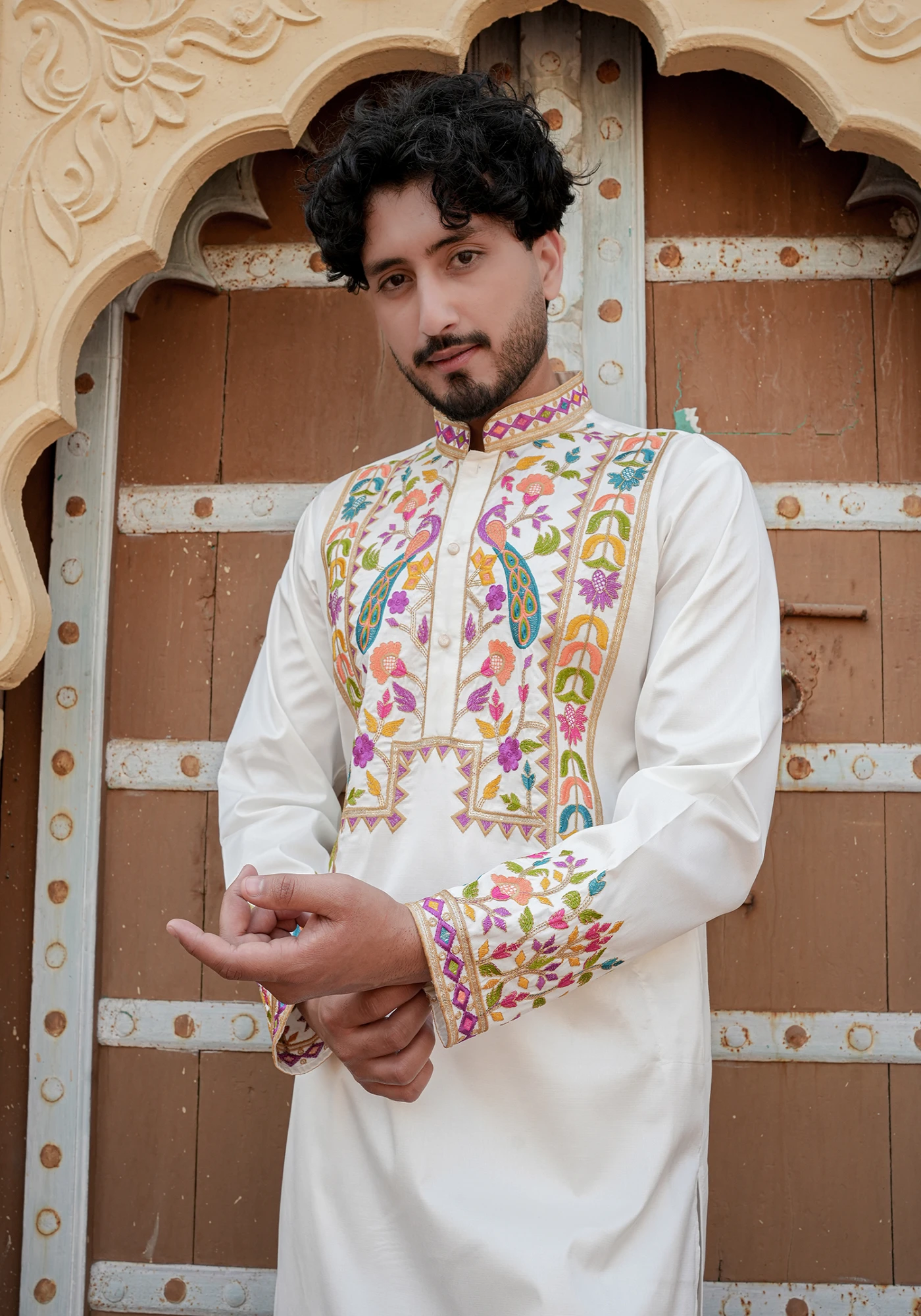 Pair with crisp white trousers and traditional sandals or mojris to highlight the vibrant embroidery and complete the festive look.