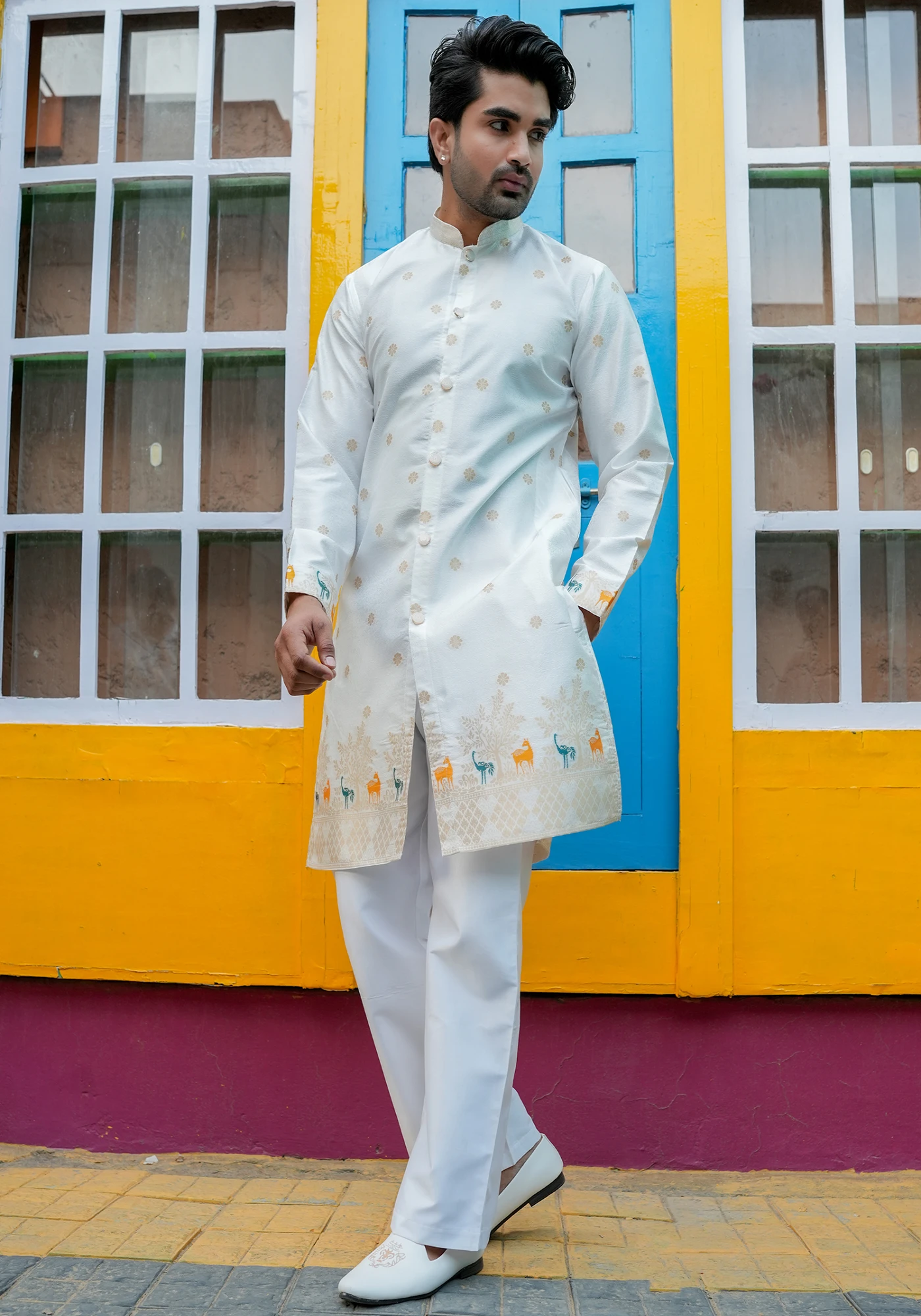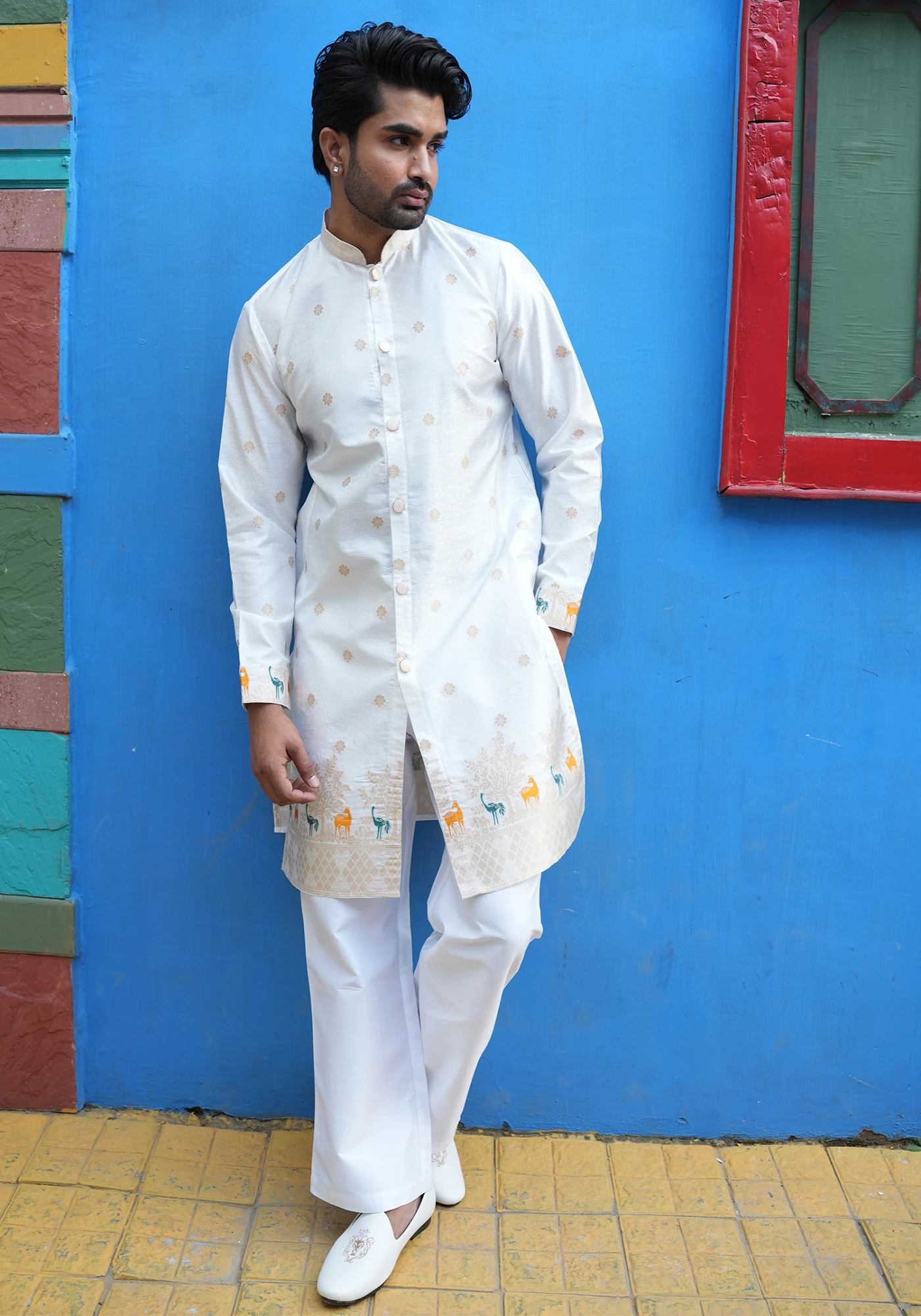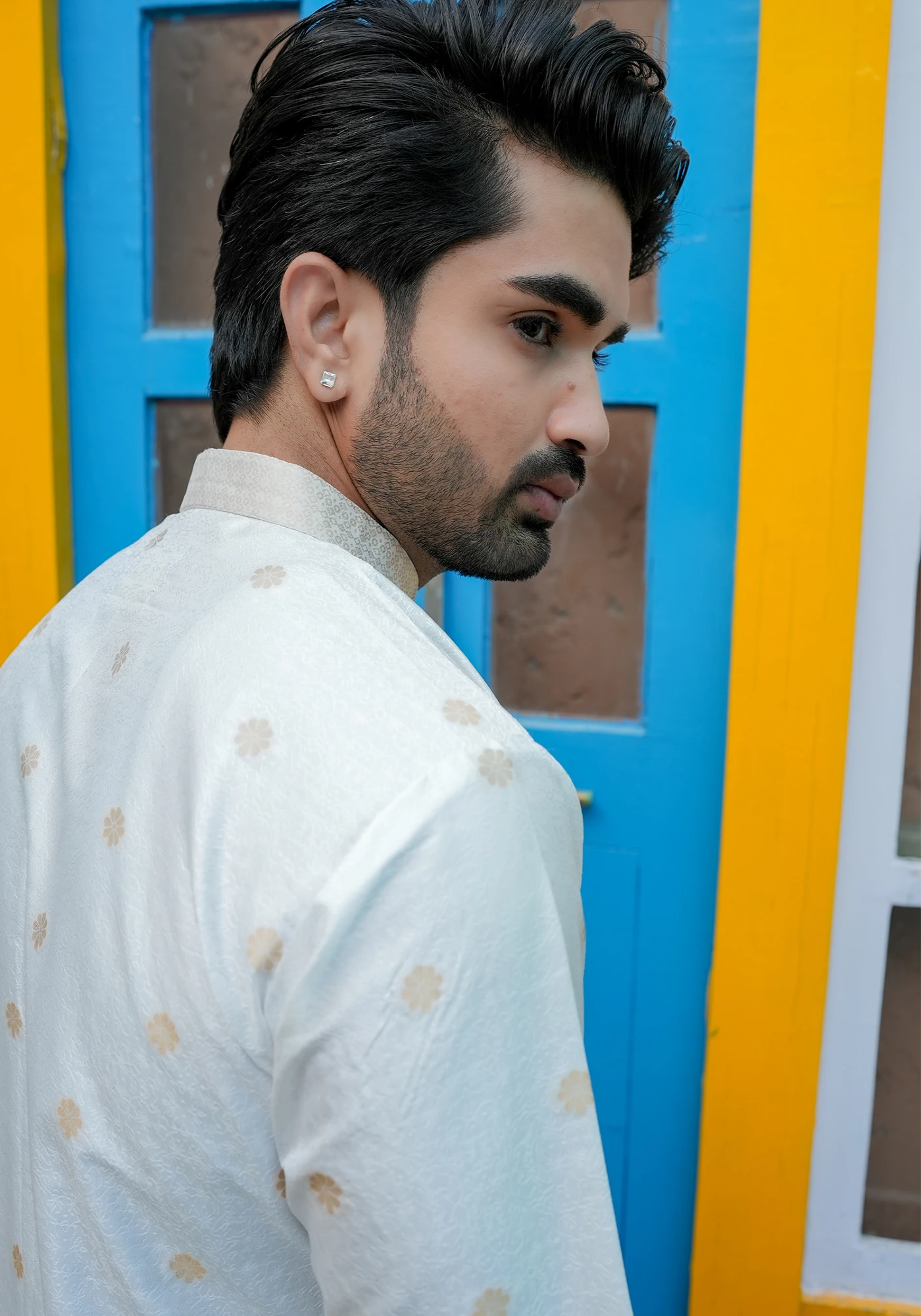 Fresh, vibrant, and effortlessly stylish β this White Printed Designer Kurta brings a modern twist to traditional ethnic wear. The soft lavender base is enhanced with subtle gold motifs and distinctive artistic detailing along the hem and cuffs, adding a playful yet refined character. Tailored in a sleek front-button silhouette, it offers a contemporary appeal while maintaining festive elegance. Perfect for daytime celebrations, festive gatherings, and cultural events, this kurta delivers comfort with standout charm.