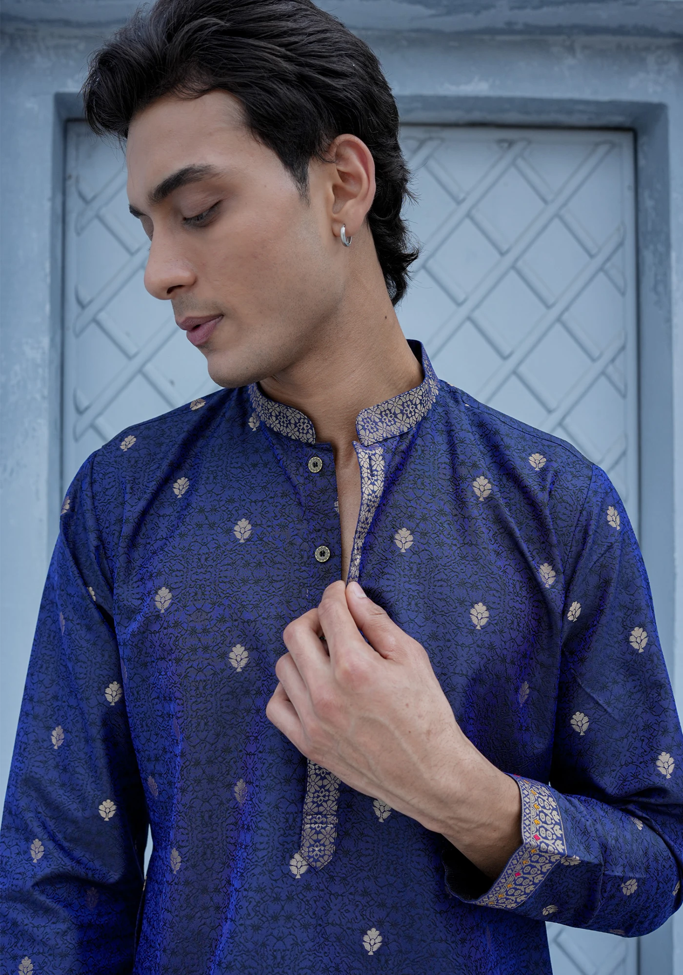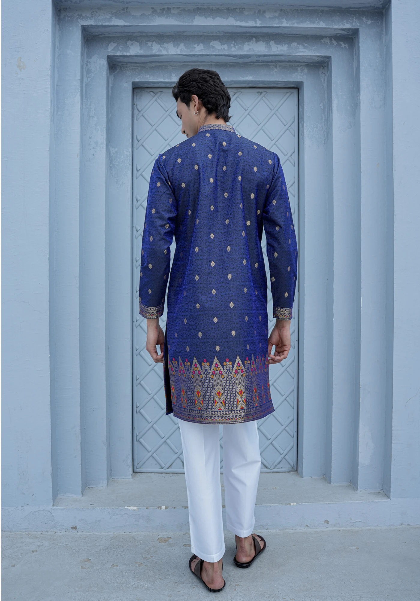 Rich, elegant, and festive-ready — this Royal Blue Jacquard Designer Kurta is crafted to make a refined style statement. The premium jacquard fabric features subtle woven motifs that add depth and texture, while the intricately designed ethnic border at the hem enhances its traditional appeal. Designed in a clean straight silhouette with a classic mandarin collar placket, this kurta blends timeless craftsmanship with modern sophistication. Ideal for festive celebrations, cultural gatherings, and wedding functions, it offers both comfort and standout elegance.