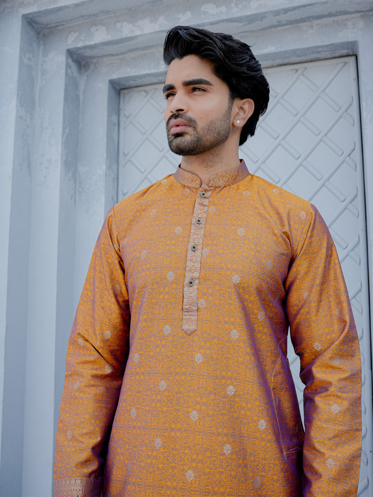 Elegant, minimal, and festive-ready — this Mustard Jacquard Designer Kurta reflects timeless ethnic sophistication. The soft cream base is enhanced with delicate woven motifs that create a subtle textured richness, while the intricately designed ethnic border at the hem adds a graceful traditional accent. Tailored in a clean straight silhouette with a classic mandarin collar and button placket, this kurta offers a perfect balance of understated luxury and modern refinement. Ideal for festive gatherings, wedding functions, and cultural celebrations, it ensures comfort with effortless style.