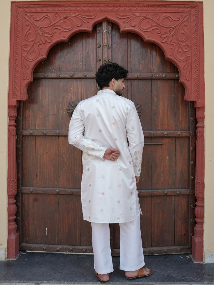 Graceful and refined, this Cream Silk Blend Designer Kurta exudes timeless festive sophistication with a subtle contemporary charm. The soft cream tone creates an elegant base, enhanced with delicate multicolour woven motifs that add understated richness to the look. Intricate ethnic border detailing along the hem and coordinated sleeve accents lend a traditional handcrafted appeal, while the clean mandarin collar and structured silhouette ensure a modern polished finish. Ideal for weddings, festive celebrations, and cultural gatherings, this kurta offers luxurious comfort with effortless style. A versatile piece designed to elevate any ethnic wardrobe with quiet elegance.