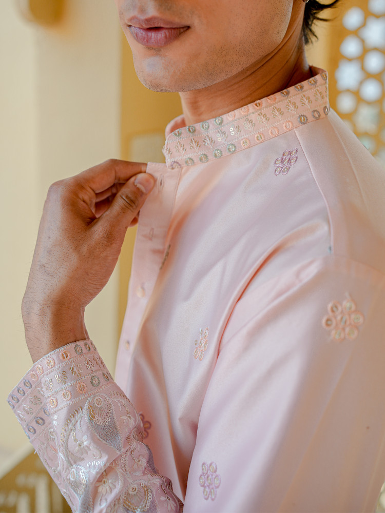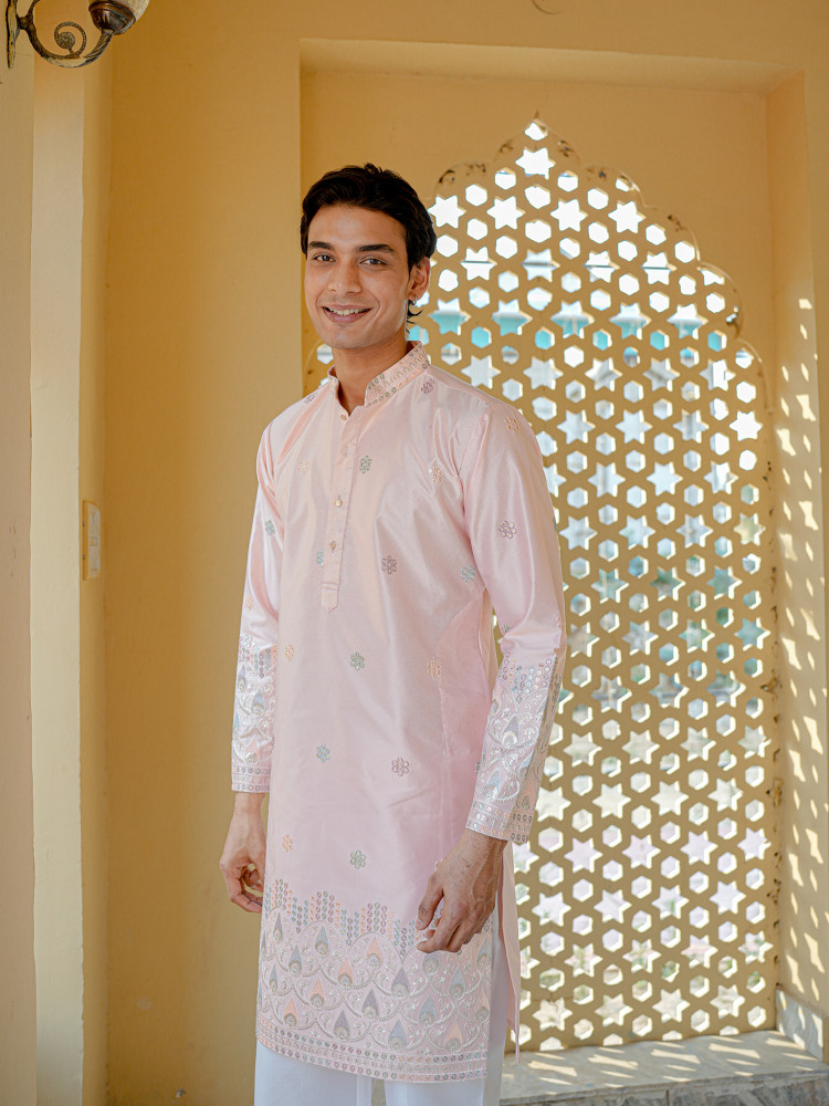 Men’s Pink Silk Blend Embroidered Kurta with with Detailed Hem Design